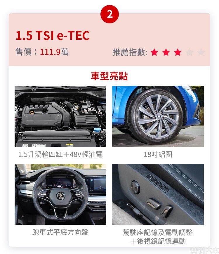 次階的Octavia,則以換上1.5升四缸動力為賣點,讓對於入門動力不甚滿意的消費者,能有更進階的選擇。配合車型升級,Octavia 1.5 TSI e-TEC也換上18吋鋁圈、平底方向盤,並針對駕駛座提供具備3組記憶功能的電動調整座椅。不過,由於配備變化不大,除非希望獲得較大動力,否則我們沒有特別推薦。