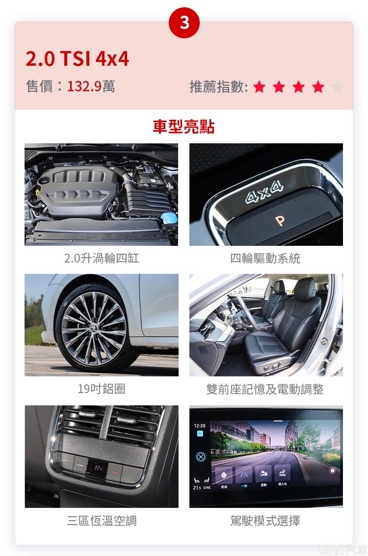 身為Combi獨有的車型,2.0 TSI 4x4顧名思義以更強勁的動力輸出和四輪驅動的循跡性做為最大賣點,由於動力差異顯著,更推薦不滿足於入門動力的消費者納入選購參考。除此之外,做為頂規車型,2.0升Combi於雙前座皆配備有3組記憶的電動調整座椅,空調系統也升級三區恆溫,更是車系中唯一可選擇駕駛模式的等級,若對動力、操控有較高需求的,自然是選擇此款。