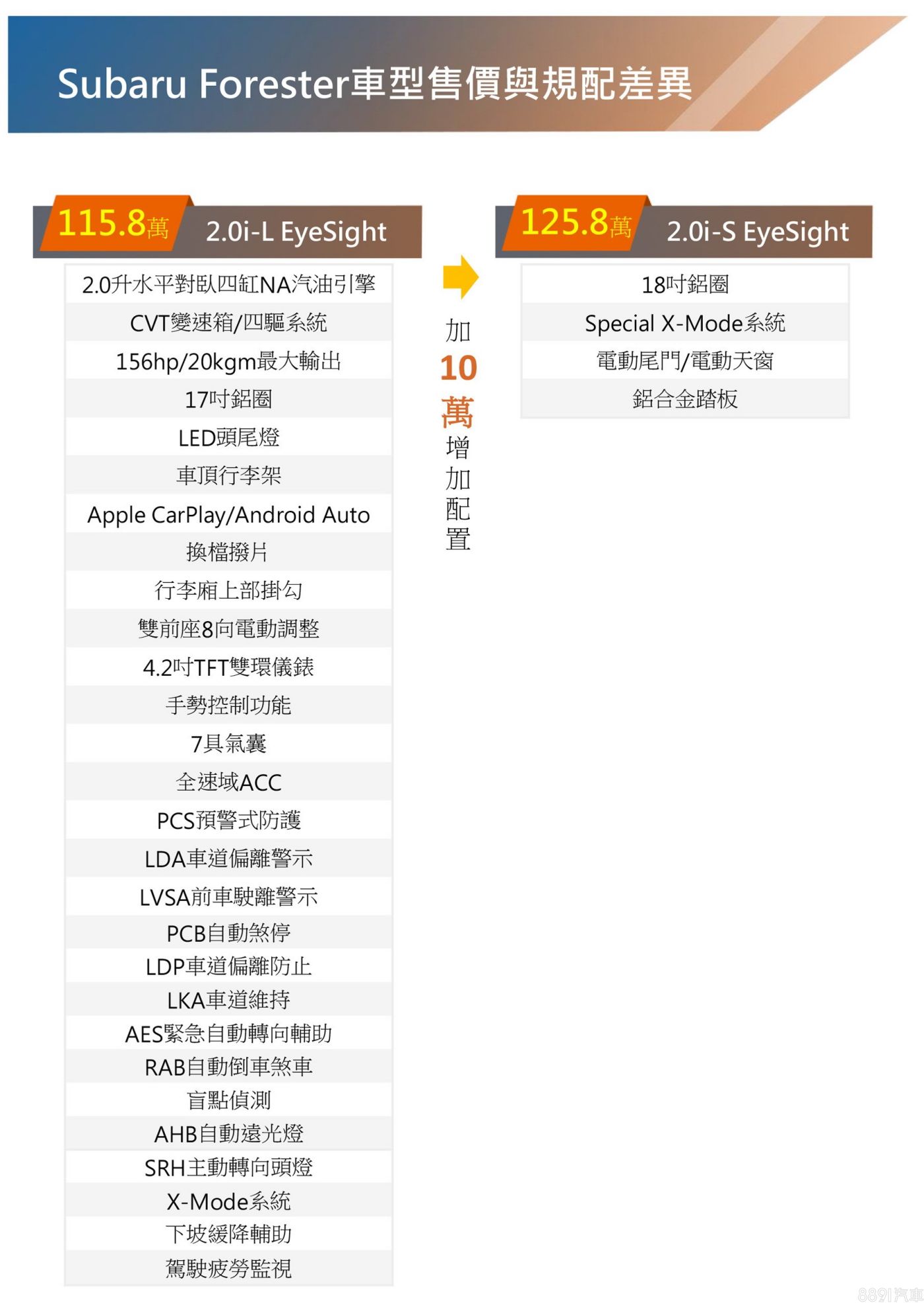 改款分為2.0i-L EyeSight、2.0i-S EyeSight兩車型,售價分別為115.8、125.8萬元,在新車上市期間Subaru有提供3萬元購車優惠,也就是112.8、122.8萬即可入手。端看雙車型配備差異,主動、被動安全皆為全車系標配,動力也相同,這次試駕的頂規版本,主要多出電動天窗、尾門,並有Special X-Mode系統增進越野能力。