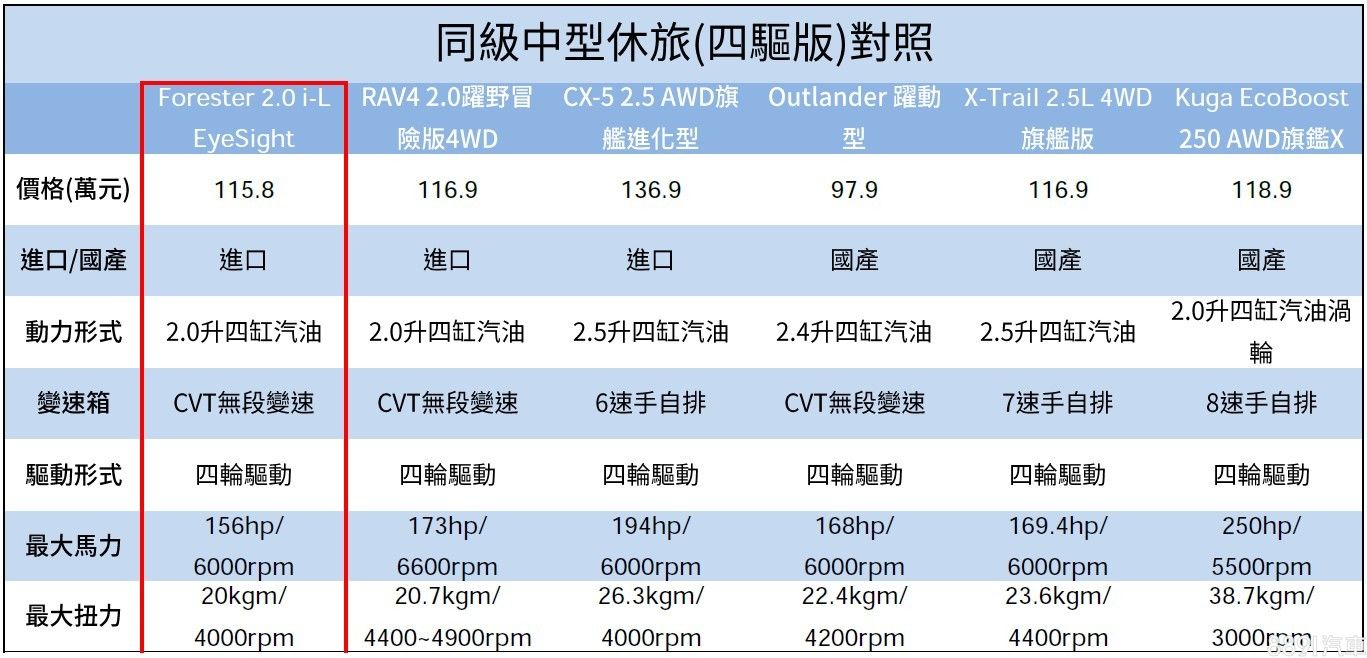 Forester全車系配置四驅系統,某方面來說,也是專打四驅休旅買家,攤開比較表,囊括進口、國產同級四驅對手並不少,真要說表列優點的話,Forester是目前進口車中最便宜的四驅選擇,缺點也非常明顯,墊底的動力數據,著實讓人好奇開起來夠不夠用。