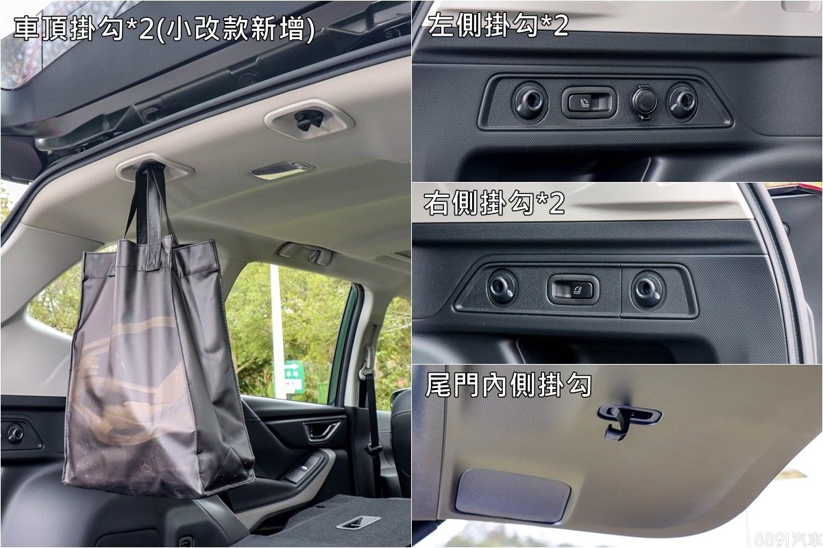 行李廂機能性頗為完善,廂內「掛勾」很多組,除既有的廂內左右側4個、尾門1個外,改款另在車頂新增兩處可承重3kg的掛鉤,總共多達7個掛勾可用,除了應付日常採買之外,也讓戶外活動、露營多點便利性。