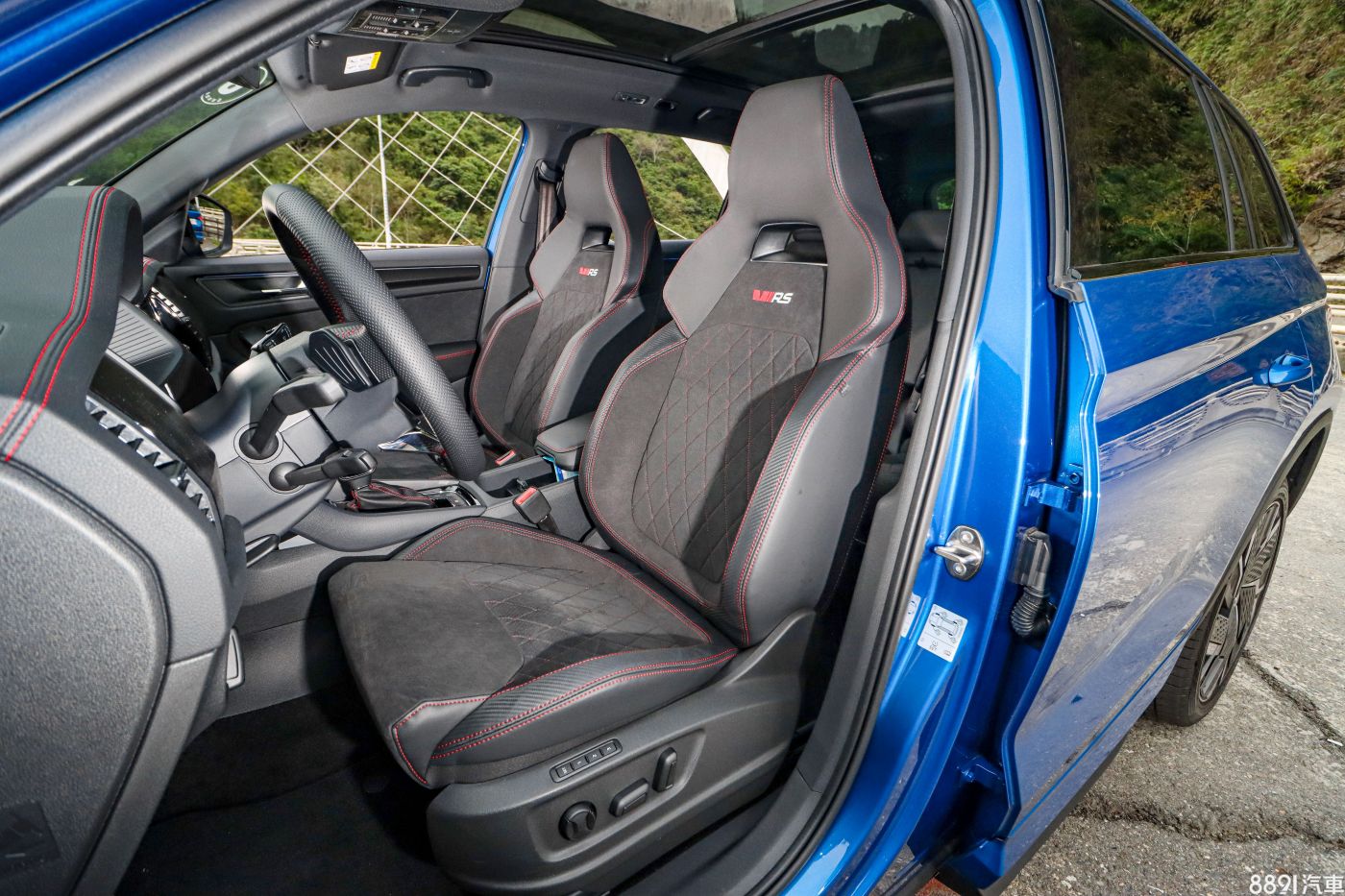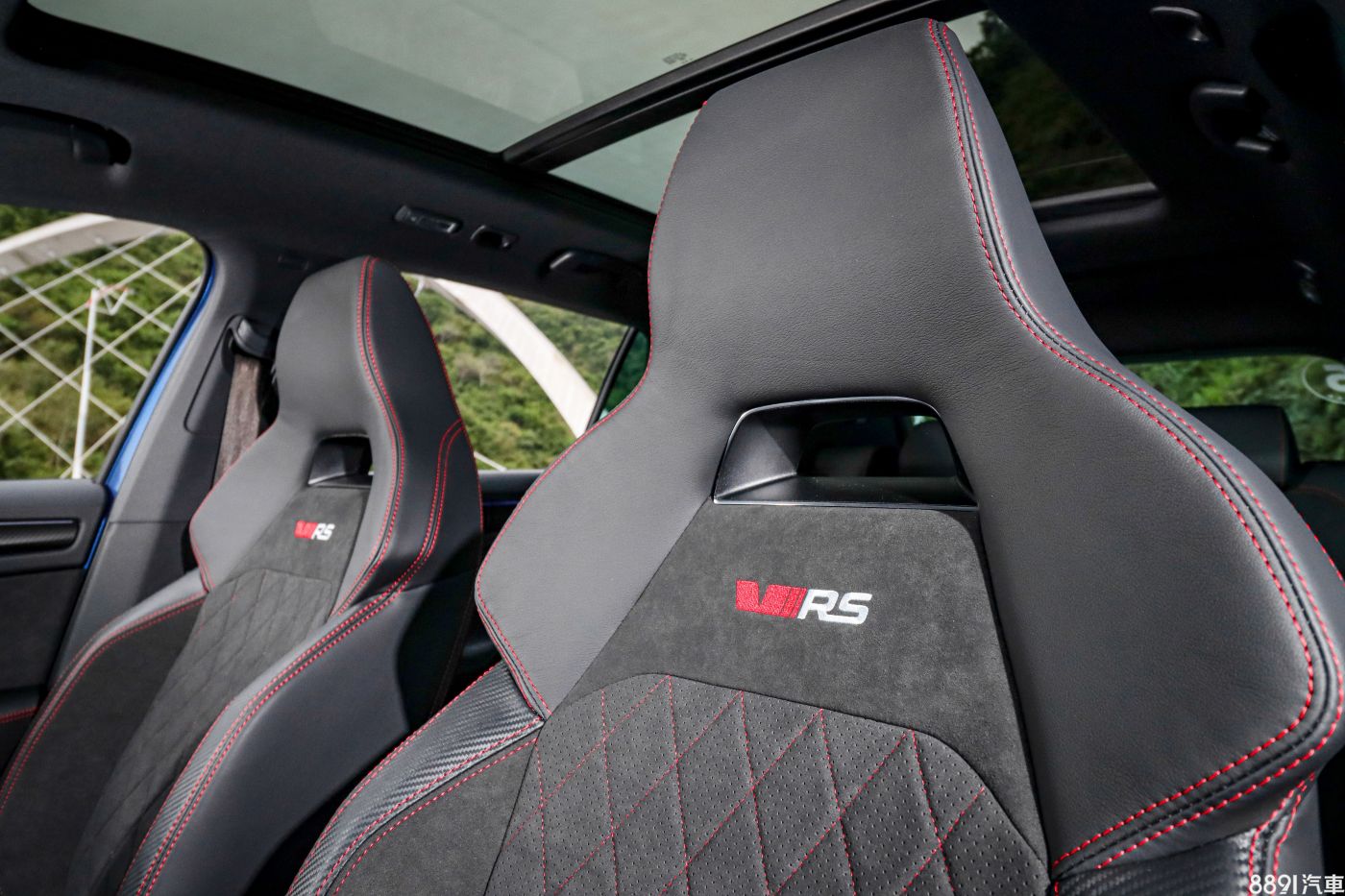運動化座艙怎少得了跑車化座椅?採頭枕整合造型的雙前座,椅面以仿麂皮包覆,搭配碳纖維紋路布邊,椅背繡上RS徽飾,光造型就相當突出。