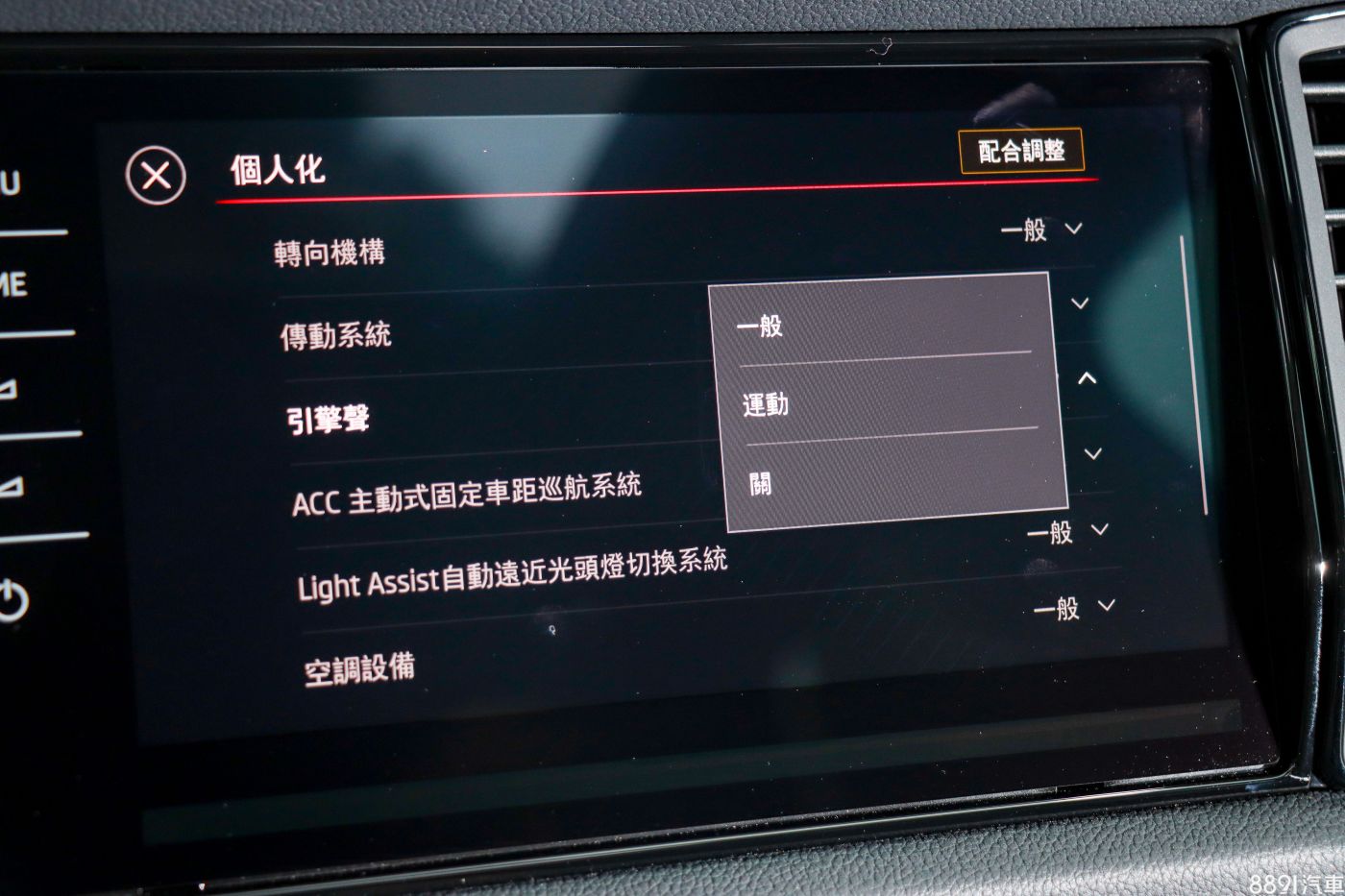 預設模式不一定能滿足所有駕駛,因此另有「個人化」模式,包含上述車輛設定在內,皆可針對個人偏好獨立調整為不同模式,然而選單式的設定介面說不上直覺,基於安全考量,建議駕駛操作時暫停路旁或委請副駕協助設定。