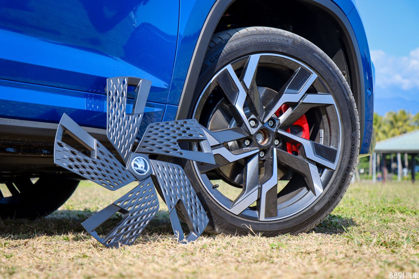 RS專屬的20吋「空力鋁圈」,配備著可拆卸的塑膠飾片,原廠稱裝配時可助減少車側紊流。配胎則採馬牌ContiSportContact 5 SUV專用胎,四輪尺碼皆為235/45R20,是主打公路行駛的運動胎款,並針對休旅車款強化載重能力。