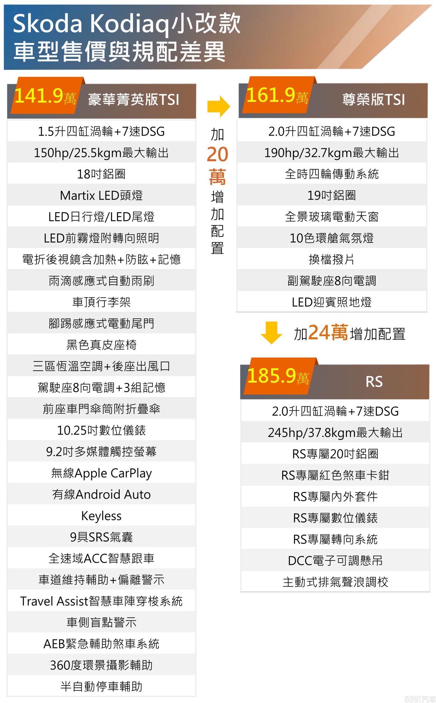 小改款Kodiaq於元月中旬在台上市,並於陣容中首度加入性能頂規「RS」,帶來更充沛的動力,也為內外添上專屬運動化包裝,開價185.9萬的售價則讓其成為當前國內市場最高價的Skoda車型。
