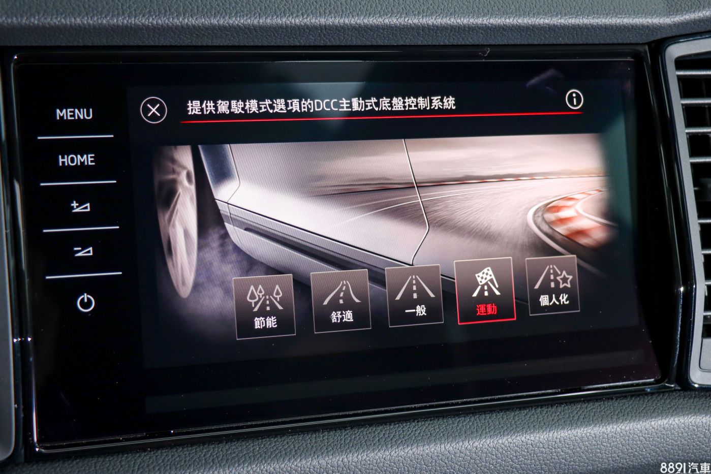 包含越野及雪地模式,Kodiaq RS提供6種預設模式可選,變更模式除了會改變螢幕被景色外,也會連帶調整轉向回饋、電子阻尼軟硬、變速箱邏輯、引擎聲浪等設定。