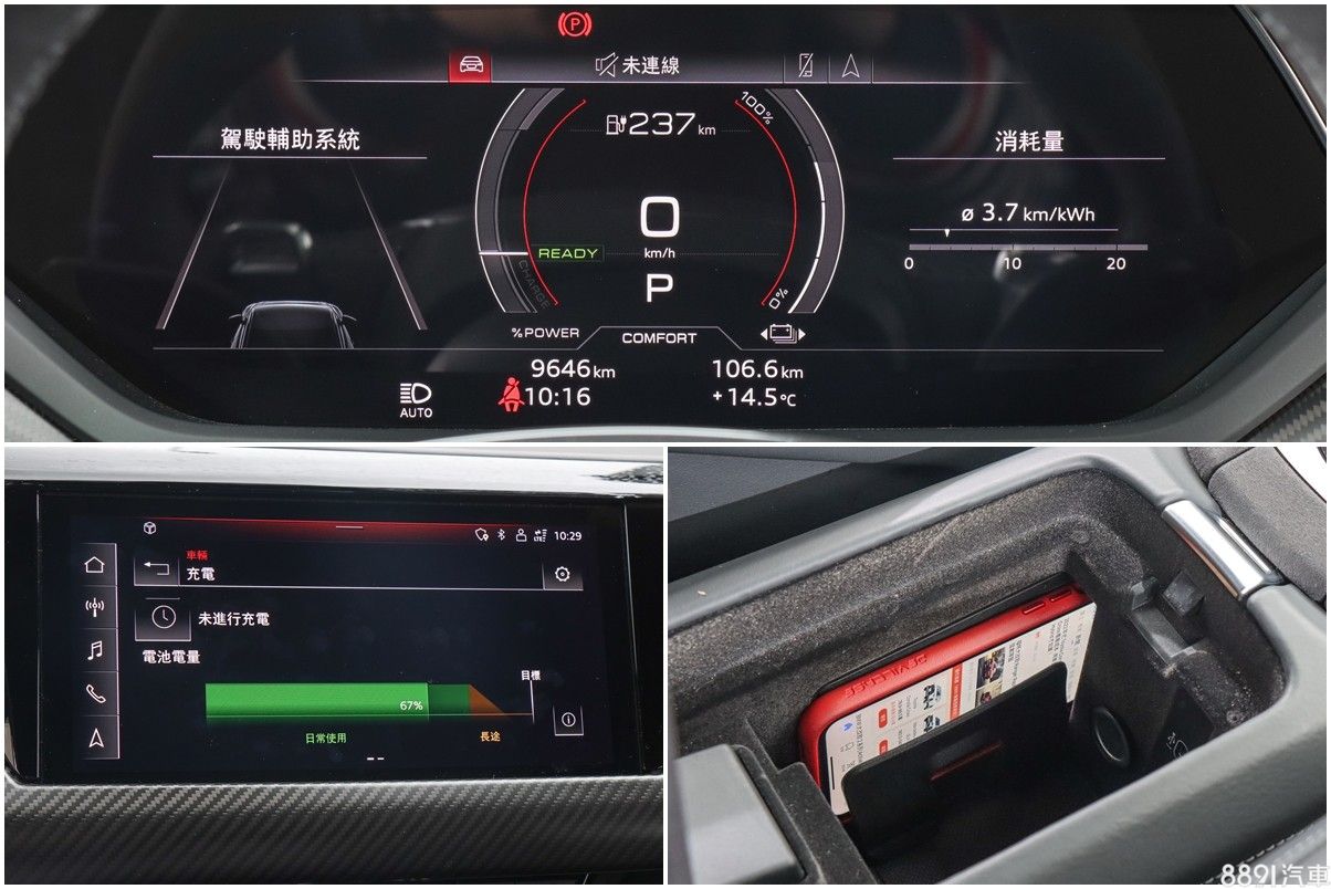 數位儀錶、中央10.1吋螢幕,介面配色採用黑底高反差搭配,看起來極簡容易判讀外,也與車飾中的黑、灰色階搭調,並有經典、運動、e-tron Sport三種顯示風格,既然是電動車,電池消耗量、平均電耗、預估行駛里程等也都能在介面中找到,且變化不同駕駛模式,行駛里程也能及時預估,易於駕駛電能管理。無線充電板位於中央扶手內,而且是夾在側邊,讓你在充電時仍有置物空間。