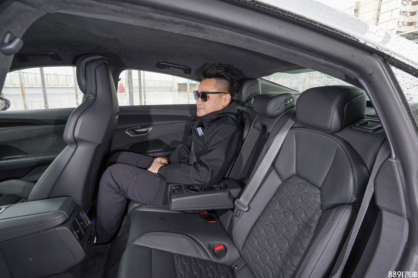畢竟為四門跑車,後座受到斜背身形影響,側窗面積小,頭部空間感也壓迫,膝部空間25.5cm以近5m車長來說也不算出色,原本RS版本配有全景天窗,但由於試駕車選配了碳纖維車頂而取消,個人感受還是喜歡全景天窗多一些,可有效放大空間感。e-tron GT後門相當厚實,但並不影響進出,門框開口最窄處都還有52.1cm,開門角度62.7°也夠大。