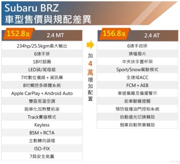 大改款Subaru BRZ車型簡單明瞭,就分為手排MT、手自排AT兩款,本次試駕車型便是手自排版本,除了變速箱差異之外,也多了EyeSight駕駛輔助系統,擁有ACC主動跟車、車道偏離警示、前方碰撞自動煞車、後方碰撞自動煞車,另外也多了HBA主動遠光燈,藉由配備差異滿足不同客群,手排版給Pro級玩家,配備豐富的自排,就留給代步需求高,偶爾上山溜溜的假日車手們!