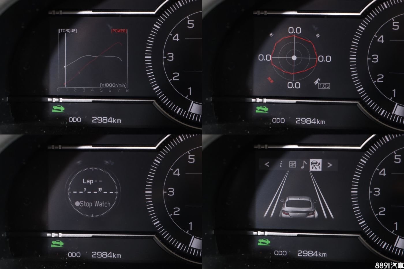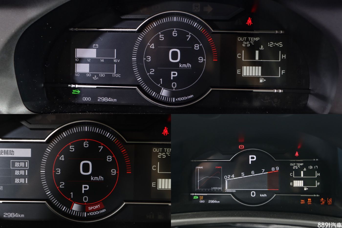 儀錶中間、左側為全彩高清TFT顯示,右邊則是單色資訊幕,在不同駕駛模式下,儀錶式樣也會改變,在Track或循跡全關狀態下,轉速長條狀顯示,配合加速聲浪服用,熱血氛圍不錯。