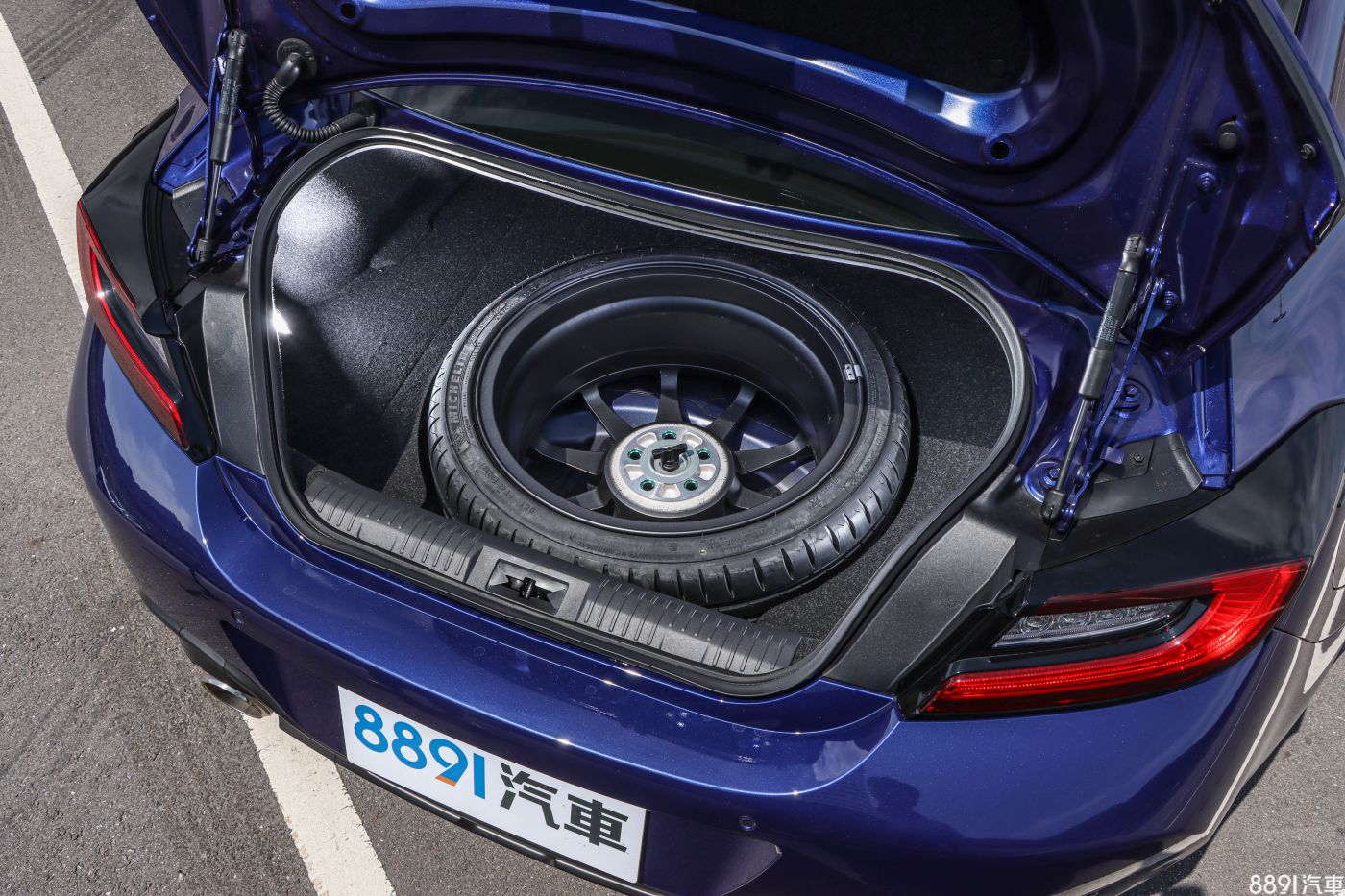打開行李廂,直接就是一組全尺寸備胎映入眼簾,礙於低底盤設計,向下空間延伸有限,無法好好把輪胎藏在底板下頭,如果是想追求實用性,將備胎移除後,在後椅背倒平狀態下,約可放進兩組高爾夫球袋,這大小相信兩人旅遊絕對夠用。