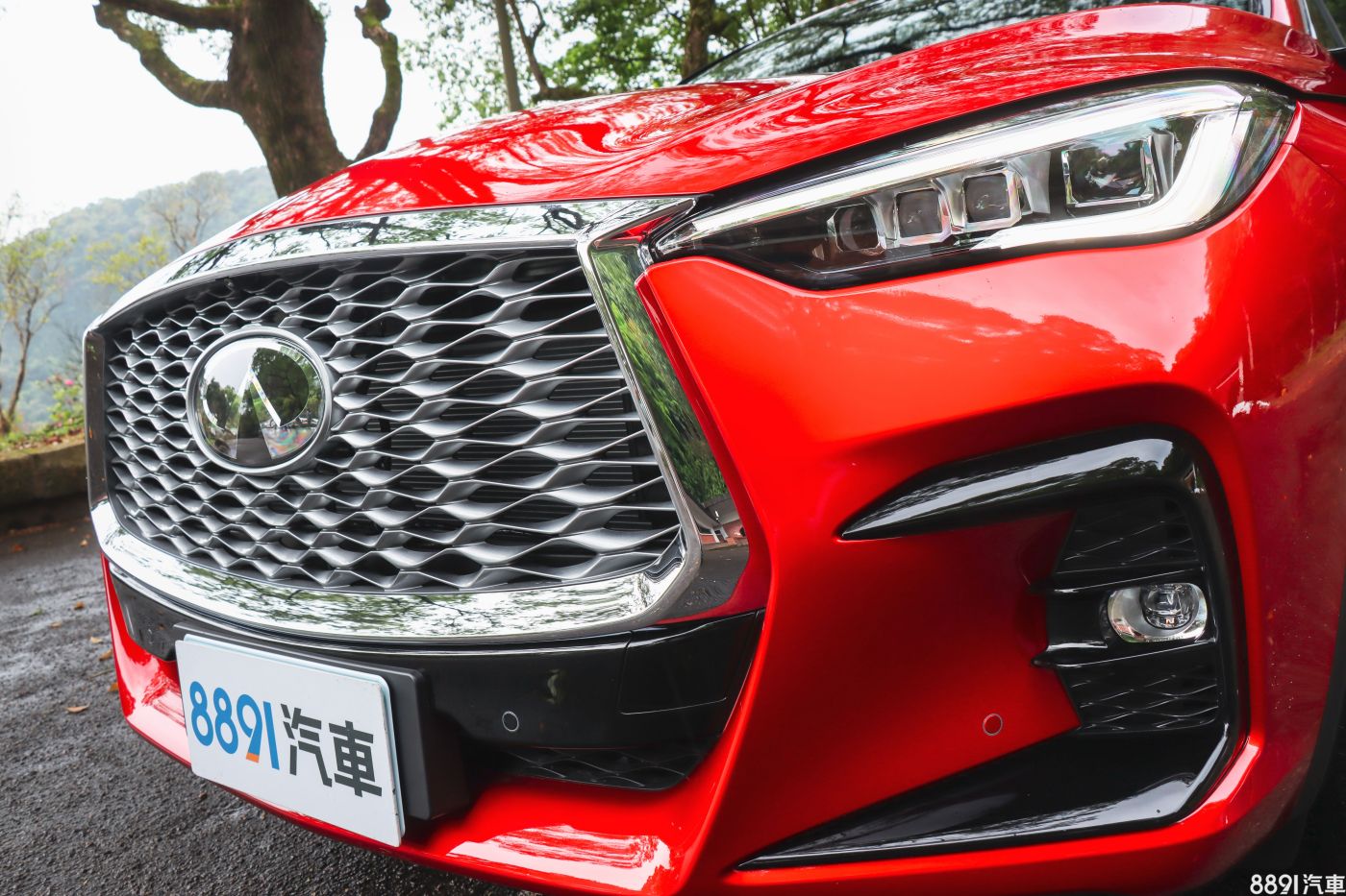 因應跑旅姿態,QX55加大下氣壩帶來更外放的視覺印象,原廠宣稱能減少行駛時的風阻,帶來節省油耗、提高穩定性的附加優勢。Infiniti招牌的雙弓式水箱護罩以日本摺紙為靈感,線條細膩流轉帶來更豐富的光影變化。全LED頭燈具備主動轉向機能,但不具自動遠近光燈與光型變換,科技性稍嫌不足。