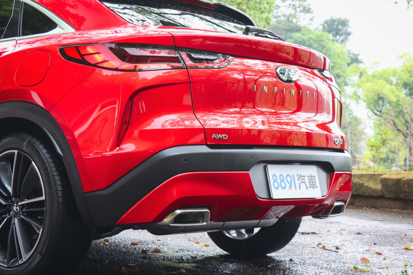 雙出尾管沒有沾染到歐系對手「假排氣」的壞習慣,不過聲浪調校偏低調、沒有太多聽覺熱情。QX55在台僅導入四輪驅動單一車型,配備水準比照QX50旗艦型,因此車尾也能看見AWD銘牌。