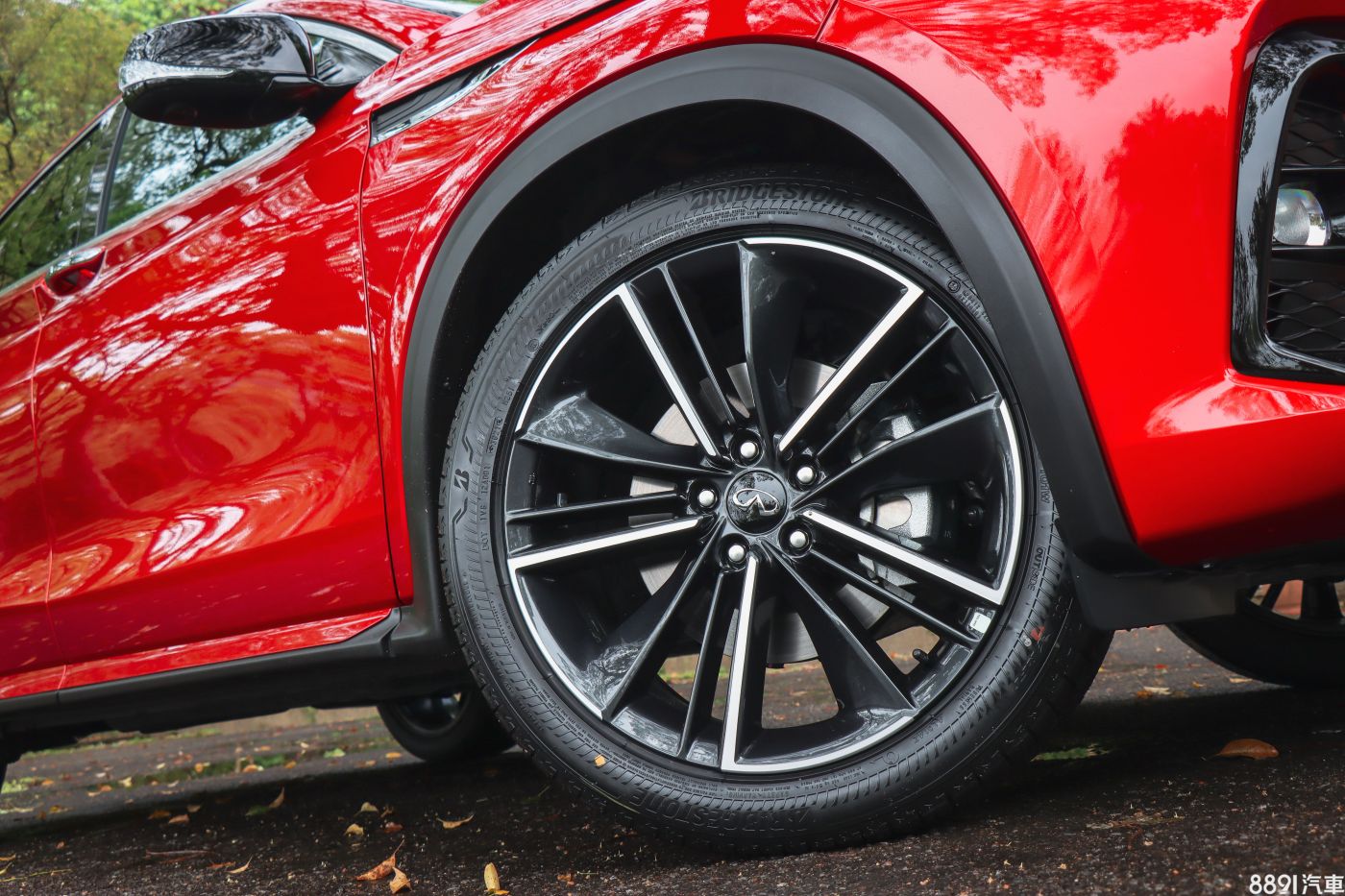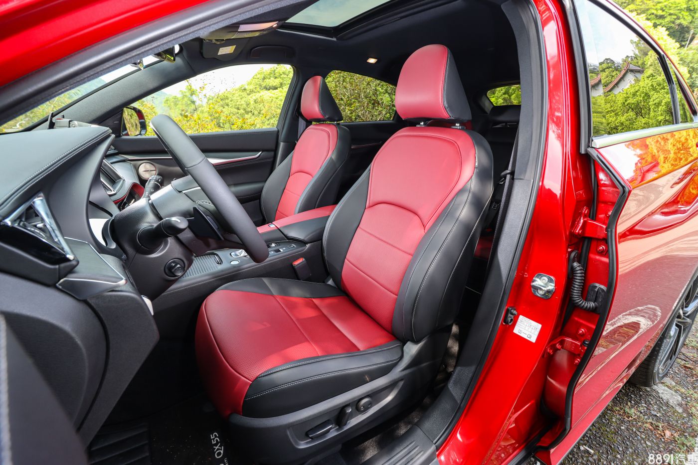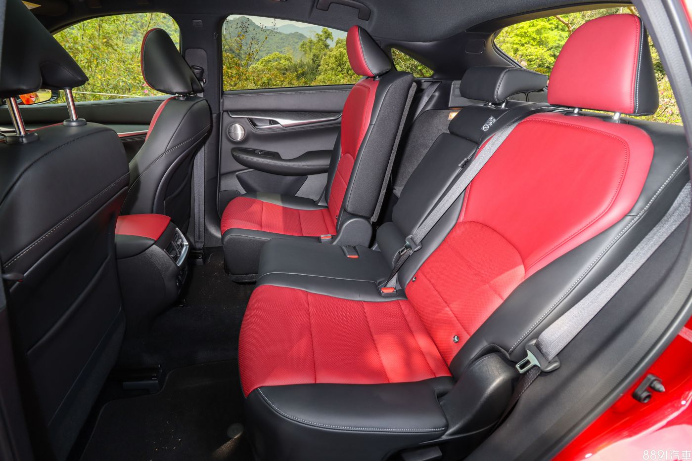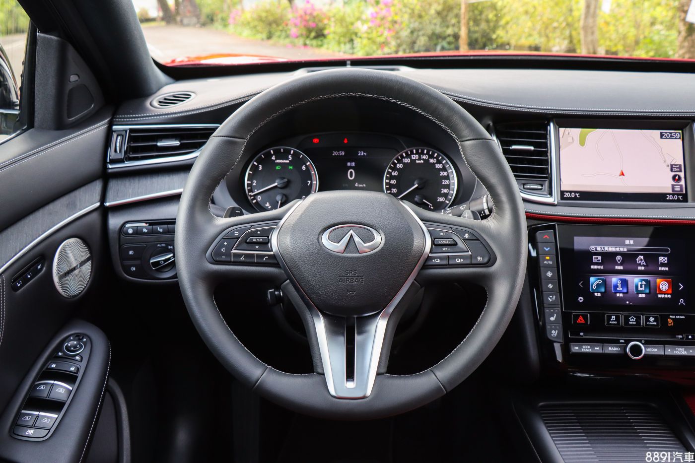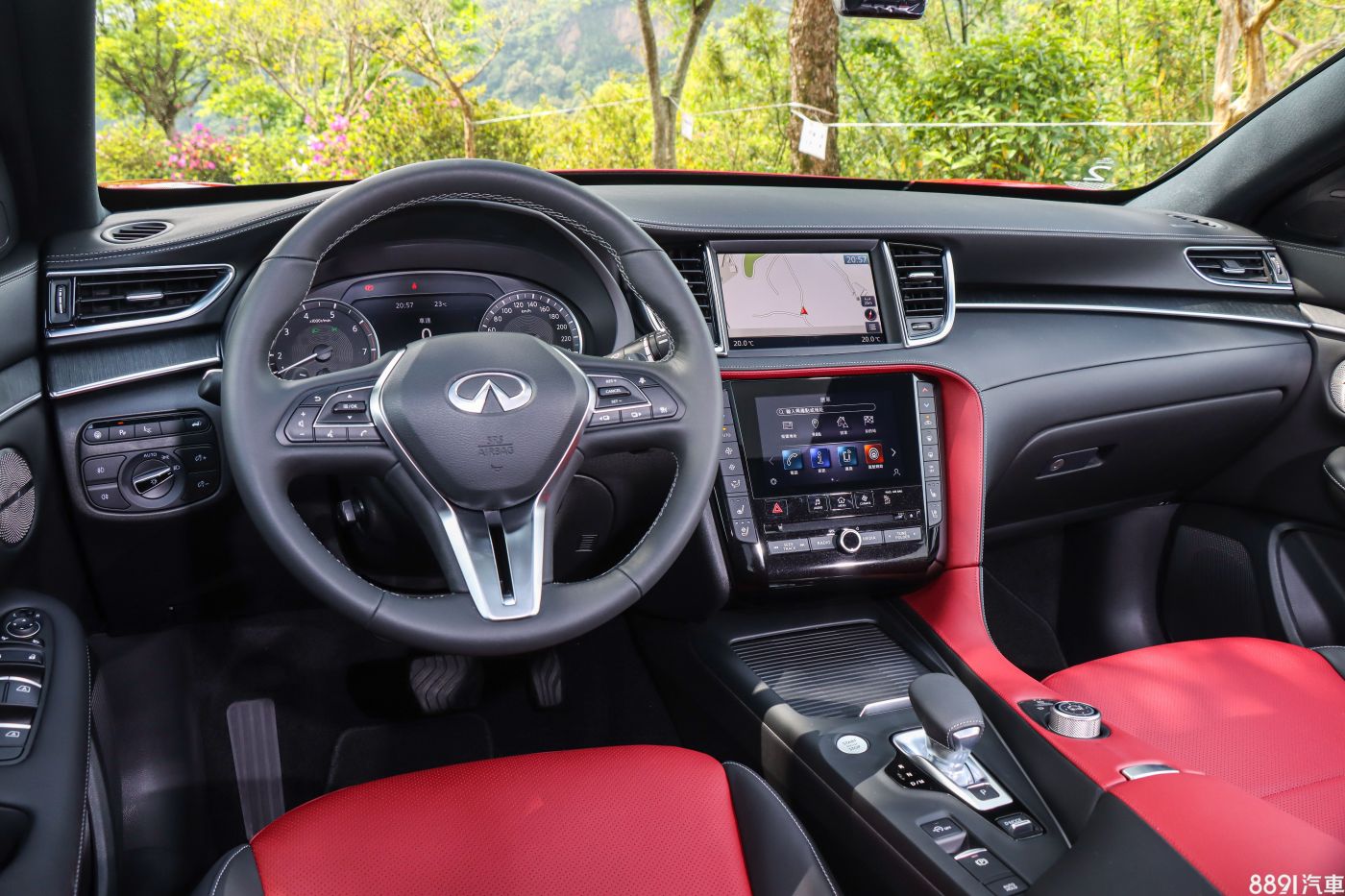 對比跑格外觀,QX55室內並沒有太多運動氣息,取而代之則是柔和線條流轉車室,帶來細膩氛圍,伸手所及多處採用皮質包覆,手感出色。標配黑色內裝,另提供照片中的黑紅內裝與黑白內裝供選擇(接單生產),但無需額外加價。