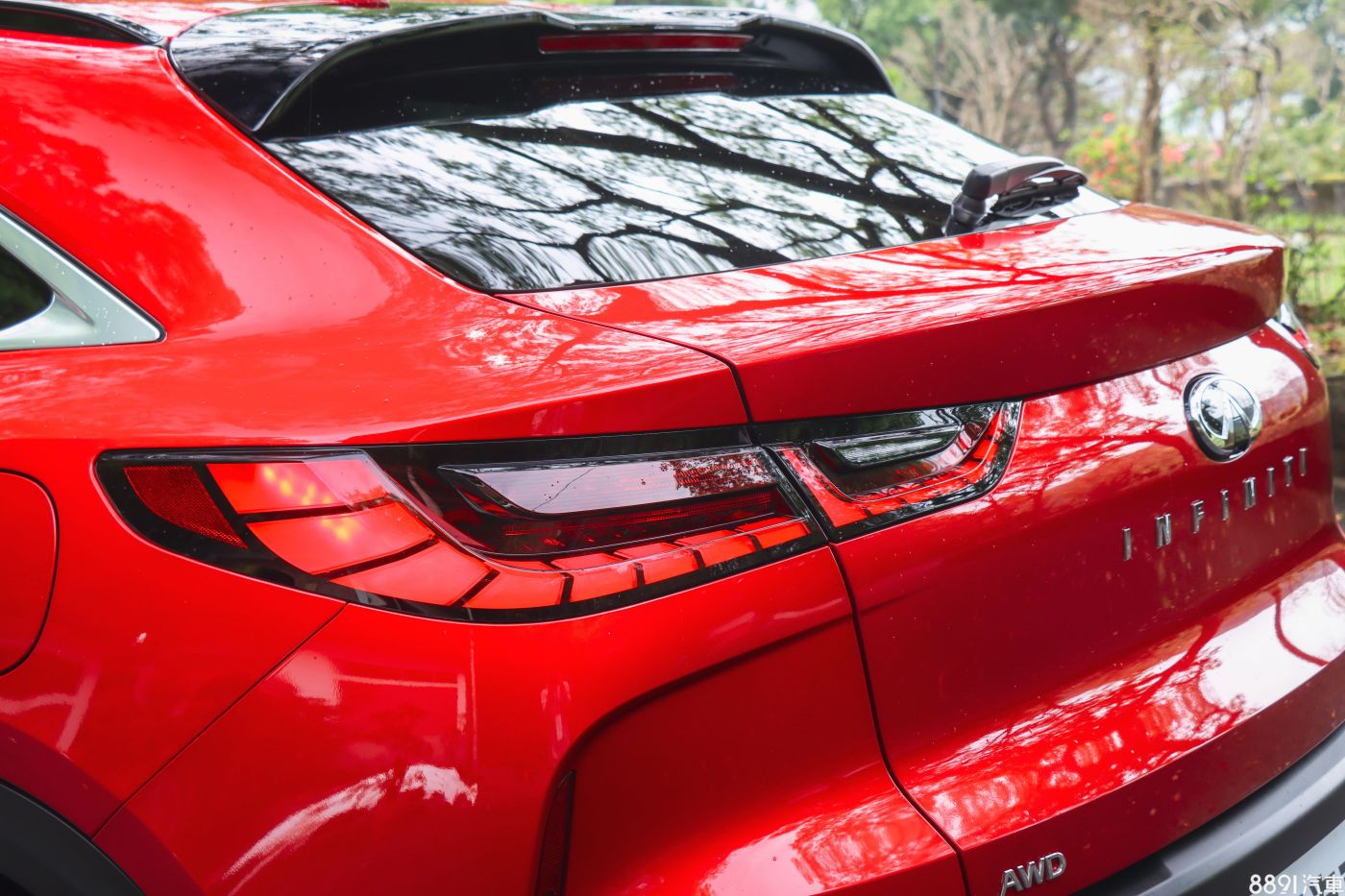 相較QX50標準SUV設定、QX55在車身後半採用Coupe般的斜背線條,圓弧窗框與尾燈銜接,乍看還真有幾分初代FX車系的影子,厚實車尾層次豐富,橫置尾燈、雙出尾管,印象中跑車該有的元素在QX55身上一應俱全,不因SUV車體而顯得比例失衡。
