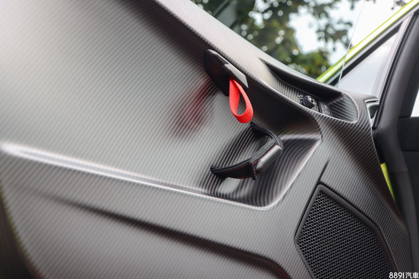 為了輕量化,也為了更近似賽車,門飾板為全碳纖維製作,門把簡單的拉環設計,雖然沒有芳香的皮革味,但細節相當細膩。