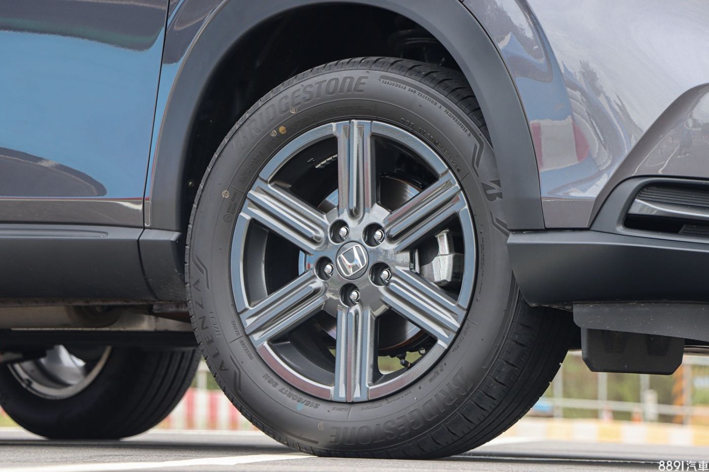 HR-V標配17吋鋁圈,造型為簡潔的六輻式樣,灰色的烤漆頗有質感,搭配215/60R17的普利司通Alenza H/L33,是一款訴求舒適、寧靜、濕地抓地表現的胎款。