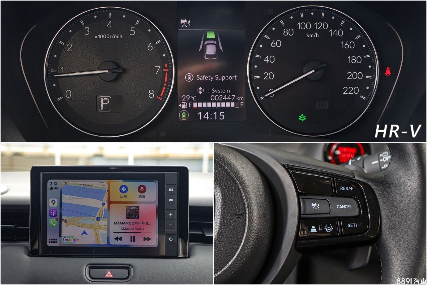 HR-V仍舊採用傳統指針搭配中央4.2吋顯示幕,雖說不影響資訊判讀,但功能簡單、沒太多驚喜;中央的8吋觸控螢幕具備中文顯示,支援倒車顯影、有線連接Apple Carplay與Android Auto,另配備有手機無線充電,功能比同場對手來的齊備;方向盤右側負責操作駕駛輔助系統,按鍵編排清楚明瞭,搭配的鋼琴烤漆也很有質感。