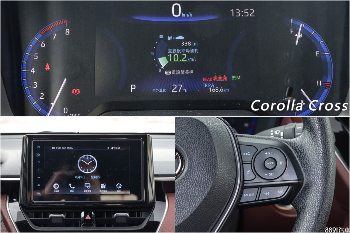 Corolla Cross尊爵版配備7吋數位儀錶,提供指針及數位兩種顯示模式;9吋Wifi主機採中文化顯示,畫面編排簡單,資訊判讀也容易,不過功能實屬陽春,僅有廣播、藍牙、USB等基本功能,Apple Carplay/Android Auto等進階功能得額外選配。方向盤與排檔頭都是塑料材質,觸摸質感上略顯粗糙,盤輻右側同為駕駛輔助系統介面,操作上算是順手。