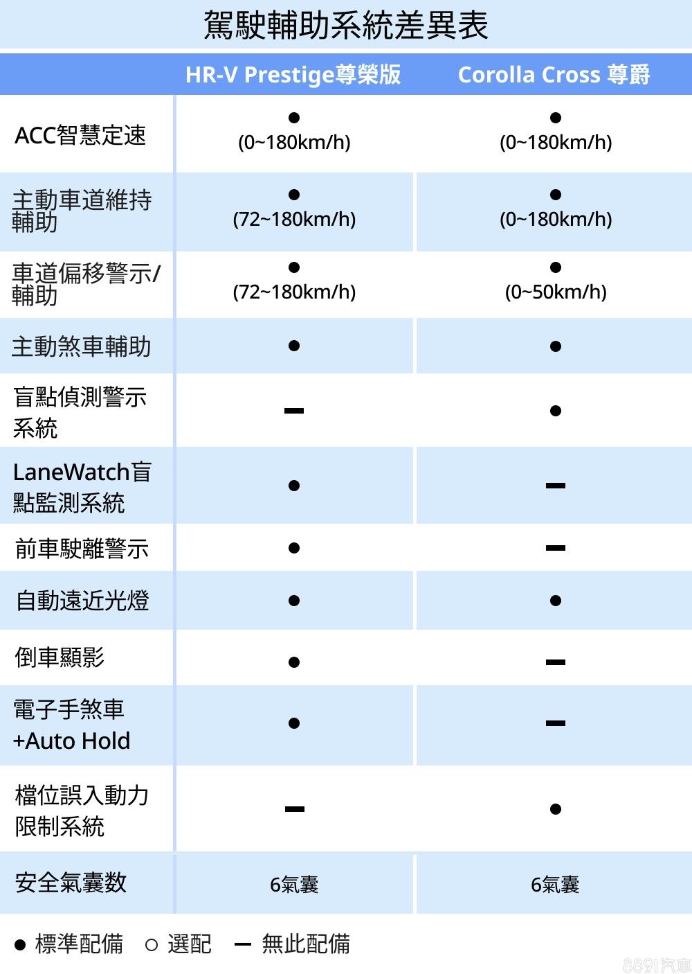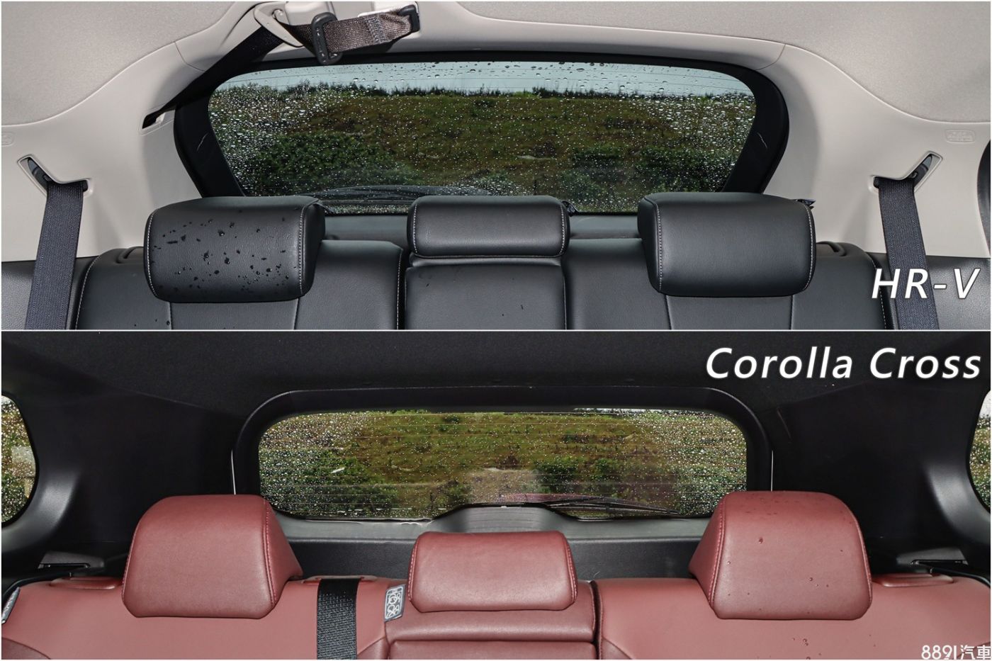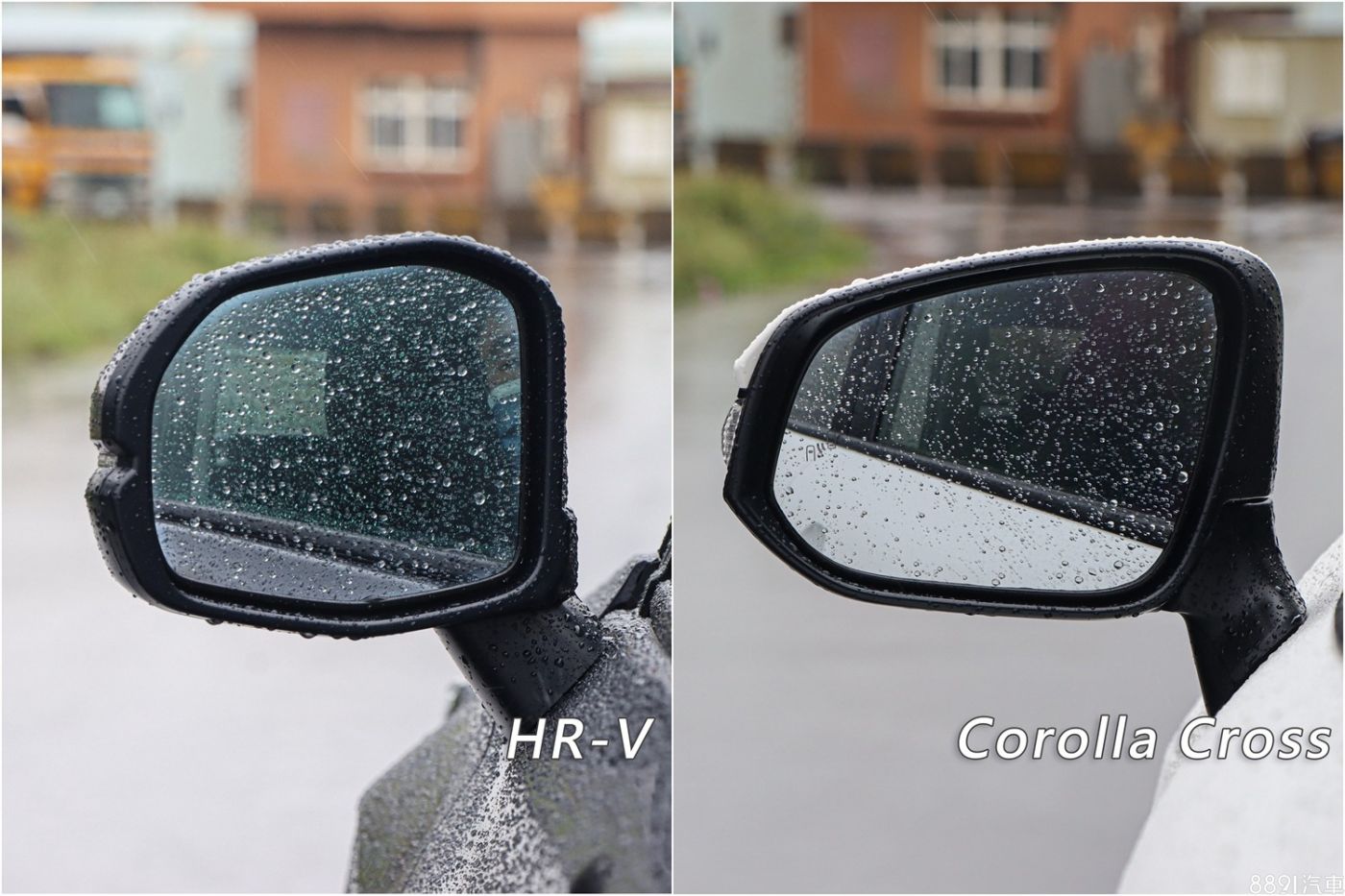 可以看到Corolla Cross鏡面較大,外緣也有向外延伸,視野角度比對手更好,還有盲點偵測系統可從旁輔助;相比之下HR-V兩側視野角度較小,盲點偵測也需選配,而配備的盲點監視系統,又僅會顯示「右側」攝影機畫面,變換車道時得多多留意路況。兩車的總遮蔽率相去不遠,HR-V為25.6%,而Corolla Cross則為25.3%。差異主要在於HR-V左右A柱遮蔽較少,加上大改款後將後視鏡自A柱移往車門,前方視野較開闊,而Corolla Cross則因為C柱較為直立且平直的腰線,讓視野遮蔽較少。