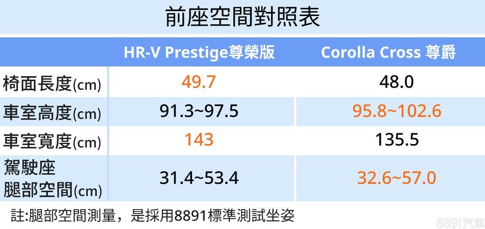 參考兩車數據,Corolla Cross車長比HR-V長130mm、軸距與車寬也都多30mm,但實際量測空間上竟「有來有往」,前座部分HR-V贏在車室寬度大上一截,置身其中明顯感受橫向寬度更勝對手;Corolla Cross則因為車高較高,在車室高度上取得優勢,頭頂上的開闊度更好。