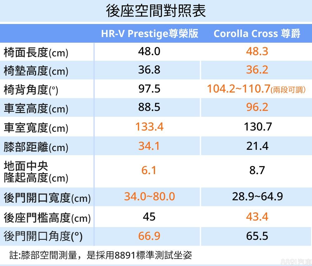 後座空間互有勝負,Corolla Cross同樣贏在車室高度,椅背設定上也較為傾斜,但在一般消費者較為在意的膝部距離、車室寬度都由HR-V勝出,尤其膝部空間大贏近13cm,置身其中十分愜意,甚至還有直逼中型休旅的寬敞度,更為平整的地板設計以及更大的車門開口角度,有利於上下車的動線,當家中有長輩或兒童進出時也會更加輕鬆。