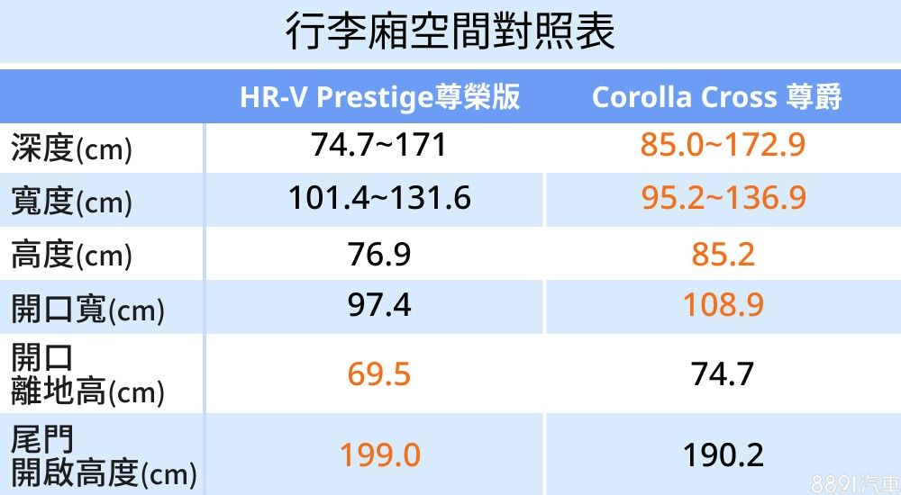 HR-V高規版配備有電動尾門,除了有感應啟閉外,還具有離開自動關閉功能,機能性上大勝Corolla Cross;單就數據來看的話,HR-V行李廂開口更低,上下行李會更輕鬆。