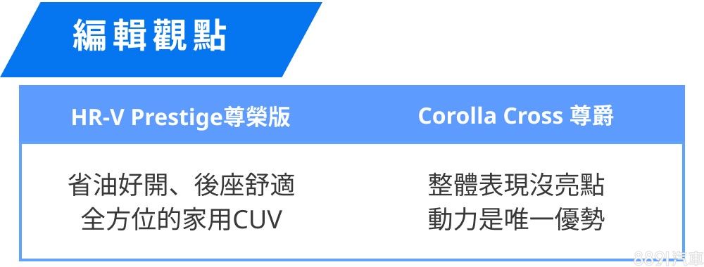 Corolla Cross動力輸出更大,無論單圈及加速表現皆優於對手,當載重或有超車需求時,更能派上用場,且僅需繳交同一級稅金,但動力大不代表操控好,激烈操駕時,還是HR-V更讓人放心。震動測試環節,兩車可說是不相上下,但體感上柔軟又安穩,還是維持豐田一貫的舒適調性,空間表現部分,則是在行李廂有著更大的裝載空間,如果你對動力有需求,那麼Corolla Cross可能更適合你。