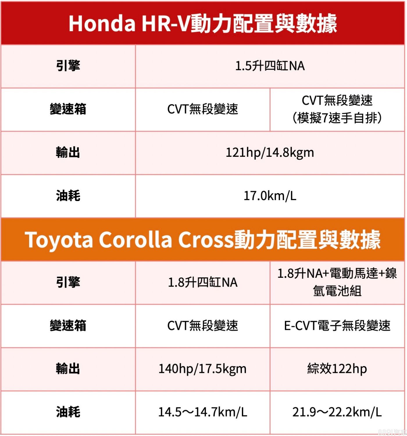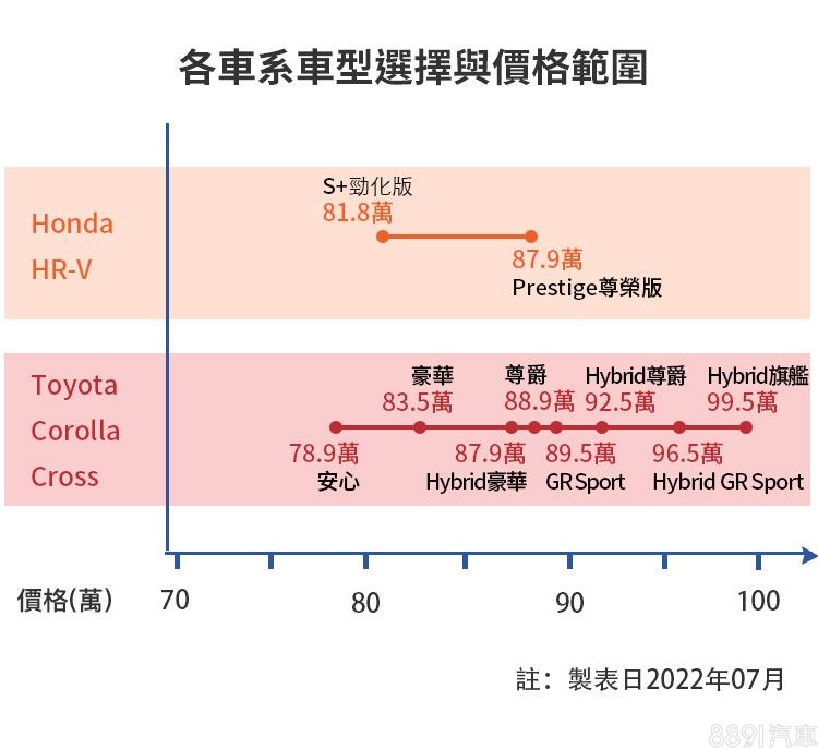 HR-V採單一1.5升四缸NA動力,相較之下Corolla Cross除了1.8升四缸NA,還有油電選項,兩車在稅金級距上旗鼓相當,但Corolla Cross油電帶來的經濟效益,在油價高漲的時期,是HR-V目前較難與之匹敵的優勢。