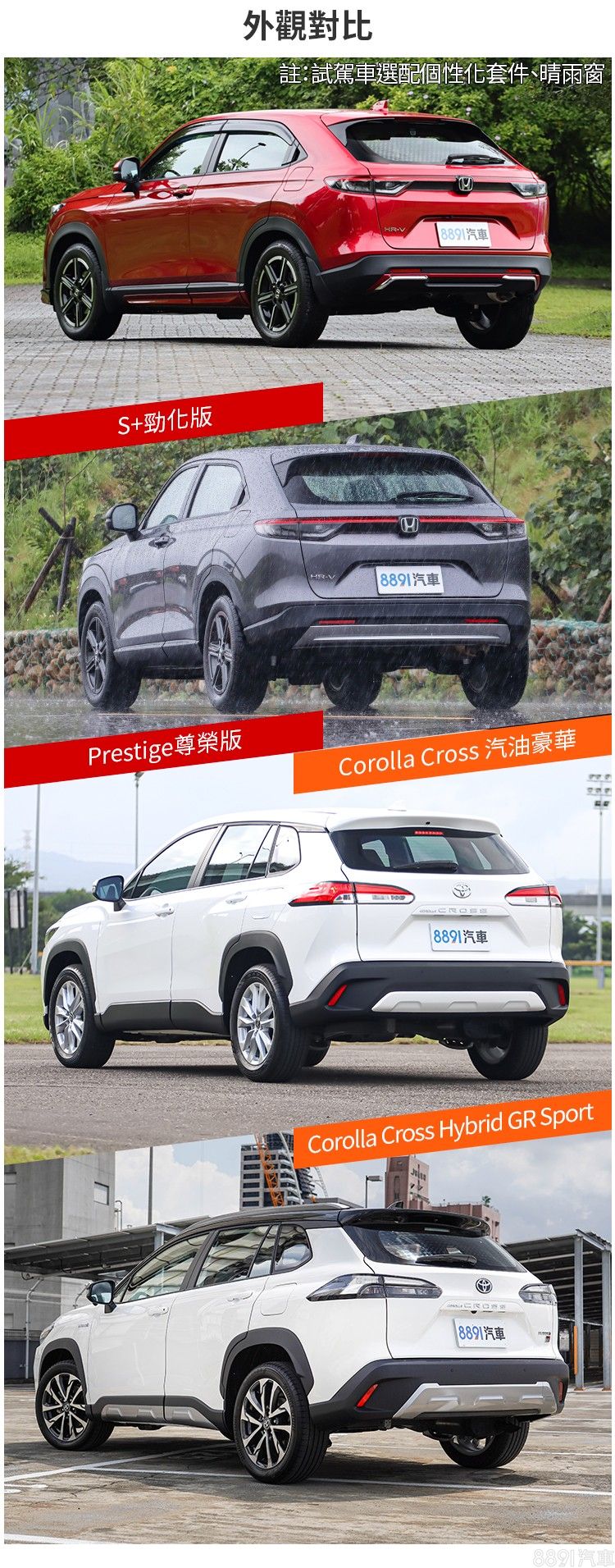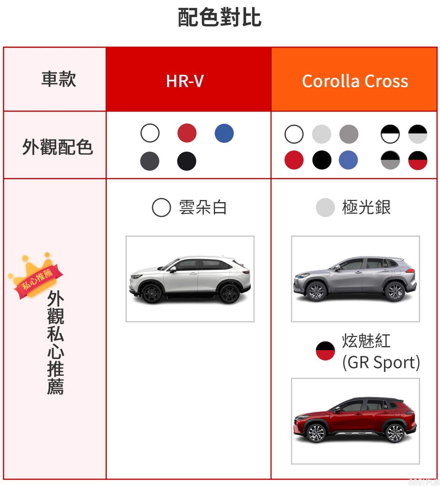 HR-V用雲朵白塗裝,更能突顯車頭標誌性的「百葉窗」水箱罩,淺色系也和這一代的斯文路線比較搭。至於Corolla Cross因為有無GR Sport的外觀風格差異大,所以個人認為有各自推薦的配色,走一般家庭取向的車型推薦極光銀,首先和佔多數的白色稍微區隔,也屬於耐看的百搭色調,而且好照顧。GR Sport強調運動氣息,2-Tone基礎配置下,銀或白的對比性也不錯,但還是選擇熱情的炫魅紅最對味!
