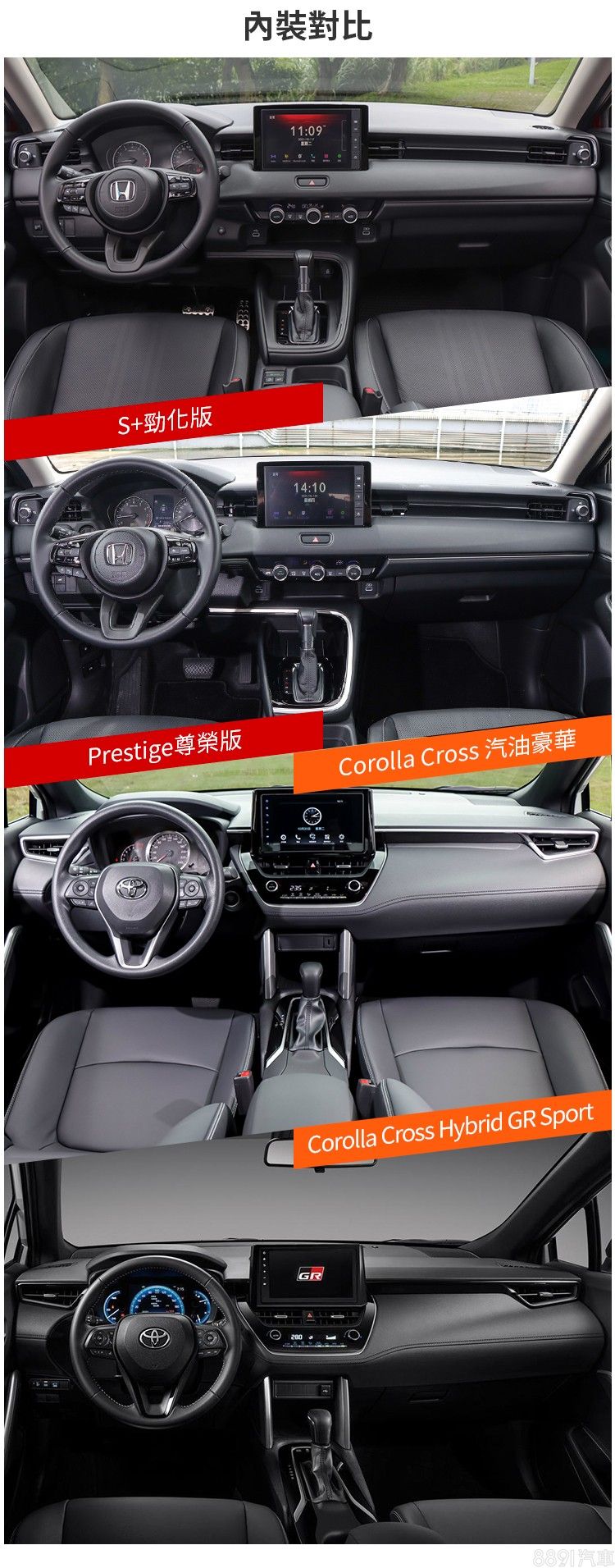 兩車在外觀配備上差異不大,具備自動調整遠近光功能的LED頭燈、電動尾門等符合身價與期待的配置都有,Corolla Cross雖多了扮相更動感的GR Sport版可選,但HR-V也有多款外觀套件能選配,不過HR-V透過較多的車身同色處理、鍍鉻材質等妝點,在質感呈現上還是略勝Corolla Cross一籌。