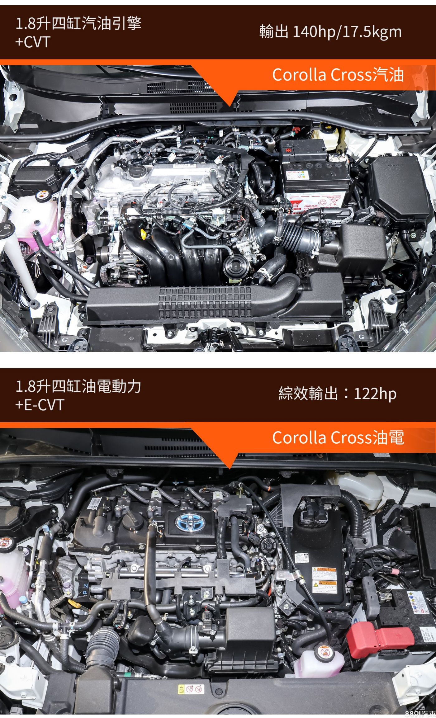 Corolla Cross動力相對更加多元,除了可產生140hp/17.5kgm最大輸出的1.8升四缸自然進氣汽油引擎,還有以同具引擎為基礎的1.8升Hybrid系統,擁有122hp最大綜效輸出,均搭配無段變速系統,前者能源局平均油耗14.5~14.7km/L,後者則為21.9~22.2km/L。