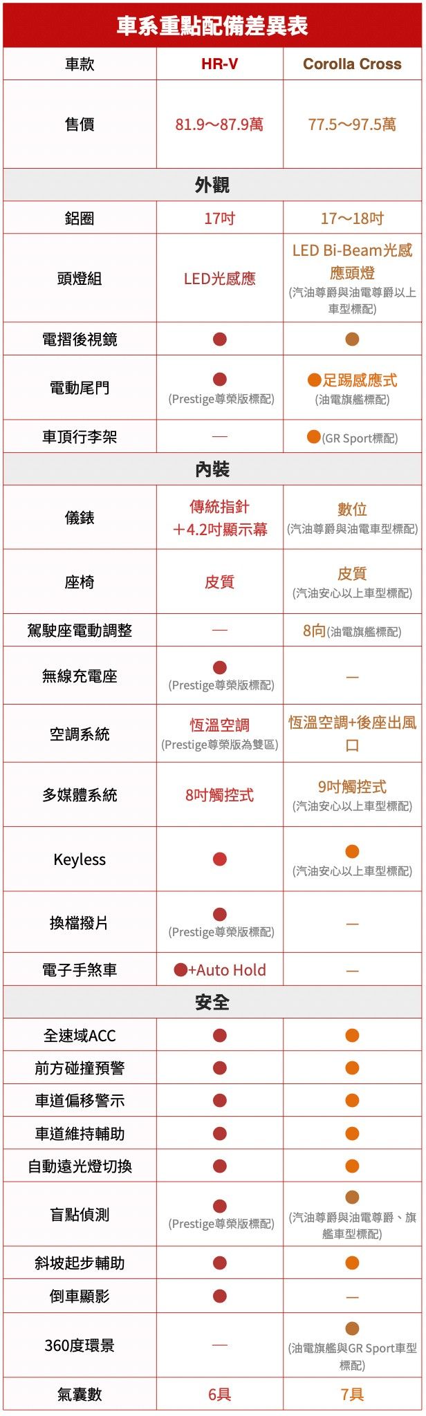 以兩車價格接近的車型比較的話,HR-V給的配備更齊全,除了比對手多出無線充電座、Auto Hold和電子手煞車,Corolla Cross的Apple CarPlay、Android Auto要另外選配,電動尾門只配在最貴的Hybrid旗艦版本,所以說,如果有預算考量又想要豐富配備,選HR-V就對了!Corolla Cross在這裡可以顯現的優勢在於車型選擇多,也滿足比較多面向的消費者,另一點是動力比HR-V充裕,用車里程數高的話,Hybrid節能又省錢。