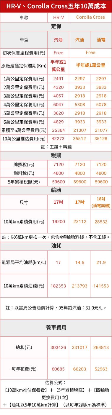 如果以HR-V針對的Corolla Cross汽油版相比,雖然定保累積的費用較高,不過輪胎價格與油資花費又比Corolla Cross便宜,高油價時代又不願選擇油電車型,且評估自身使用里程數較多的話,HR-V會比較划算。