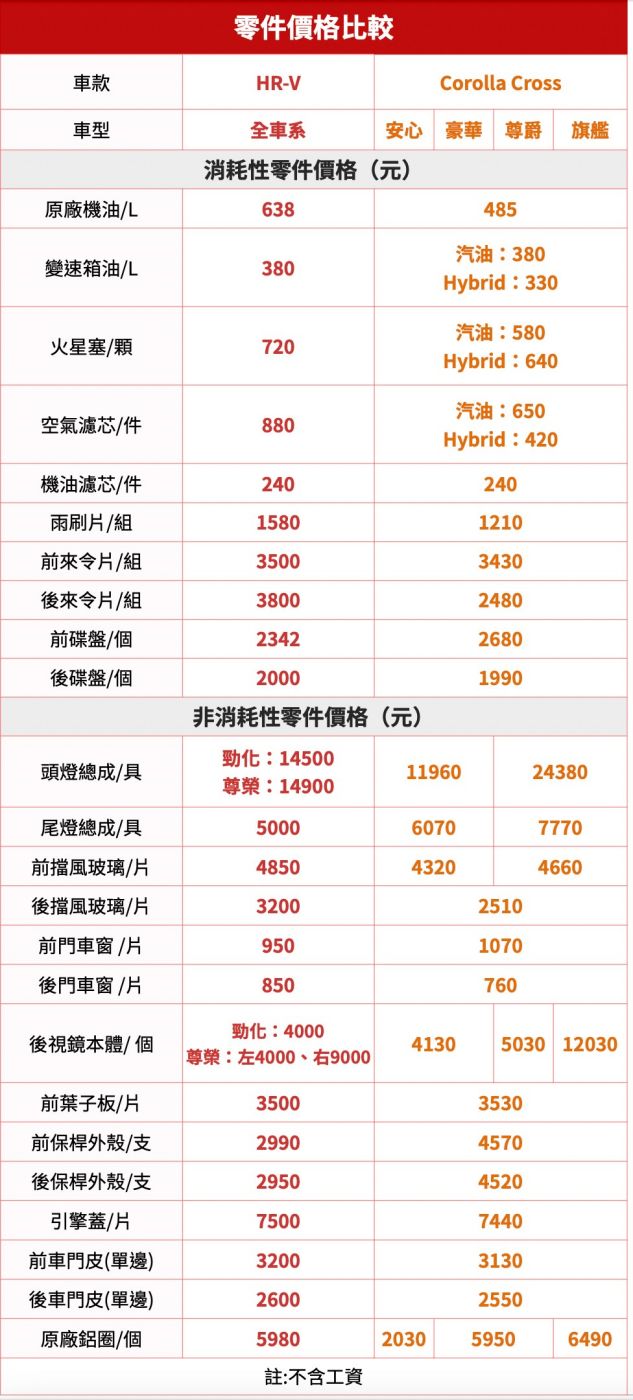 兩車之間的耗材與零件價格互有高低,整體水平差不多,不過還是有幾個需要提出的點,HR-V的原廠機油比較貴,每次保養都要換,一次又是好幾罐,看到上一張的保養成本,長久下來的費用便高出對手,在非消耗性零件可以看到燈具,一樣是LED頭燈,Corolla Crosss要24380元,HR-V則大約是1.5萬元,萬一不小心損傷、保險又剛好不能Cover,對荷包就很有感覺了。