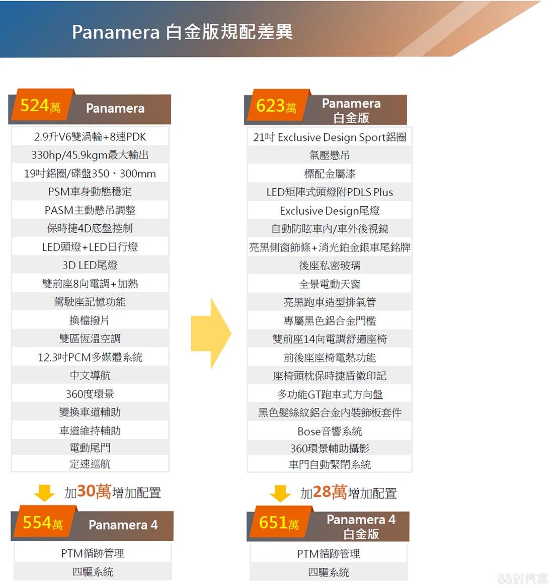Panamera和Panamera 4都提供白金版(Platinum Edition),動力配置一樣,就差在基礎配備和專屬細節,Cayenne和Cayenne Coupe車系也有相同操作,如果要自己從基礎版本選配到相同的內容,一定超過和白金版之間的價差,如果下定決心要選台漂漂亮亮的Panamera,就直接從白金版看起吧!