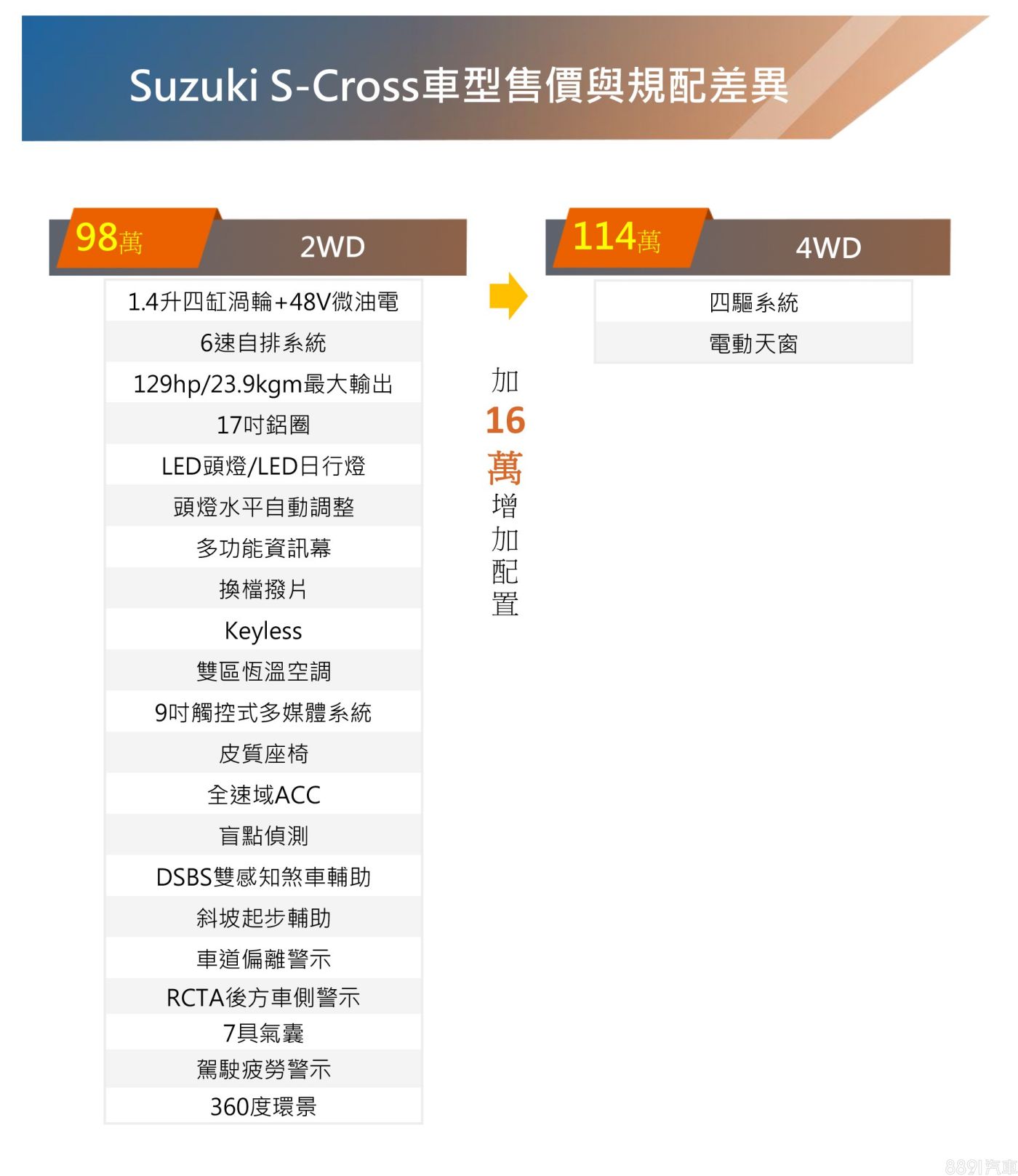 有別於上一代89萬單一車型的銷售策略,新S-Cross在國內推出雙車型編成,價格分別為98萬和114萬,其16萬價差為頂規帶來四輪驅動和全景天窗,同時也是本次試駕的版本。