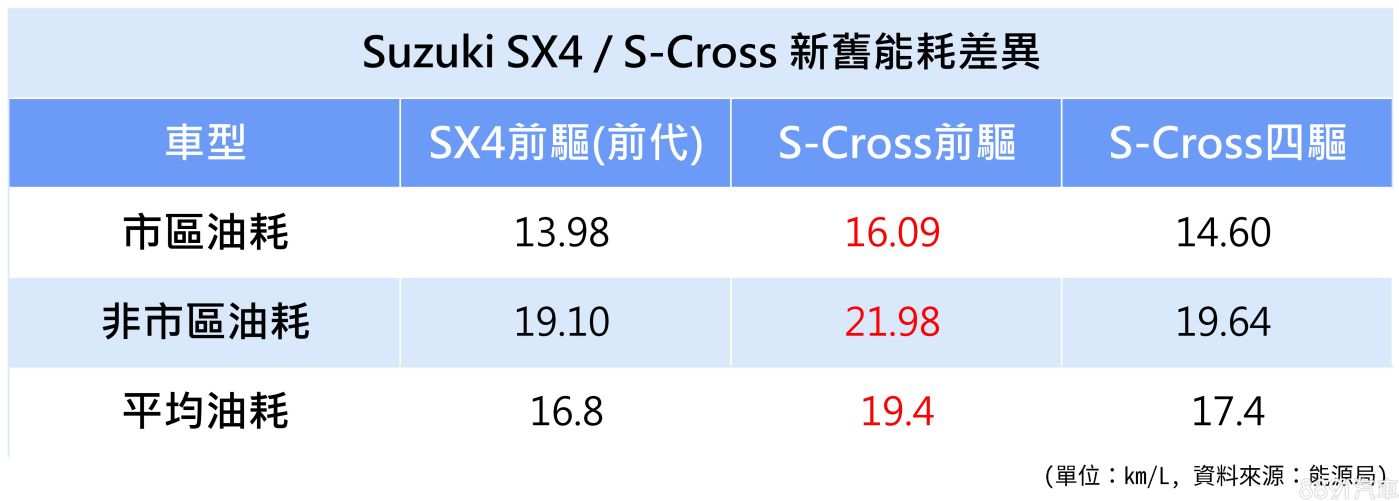 讓數據說話,導入輕油電的S-Cross,前驅款能源局平均油耗為19.4km/L,試駕的頂規亦有17.4km/L水準,即便搭載四驅,仍比僅有前驅的前代16.8km/L更省油。