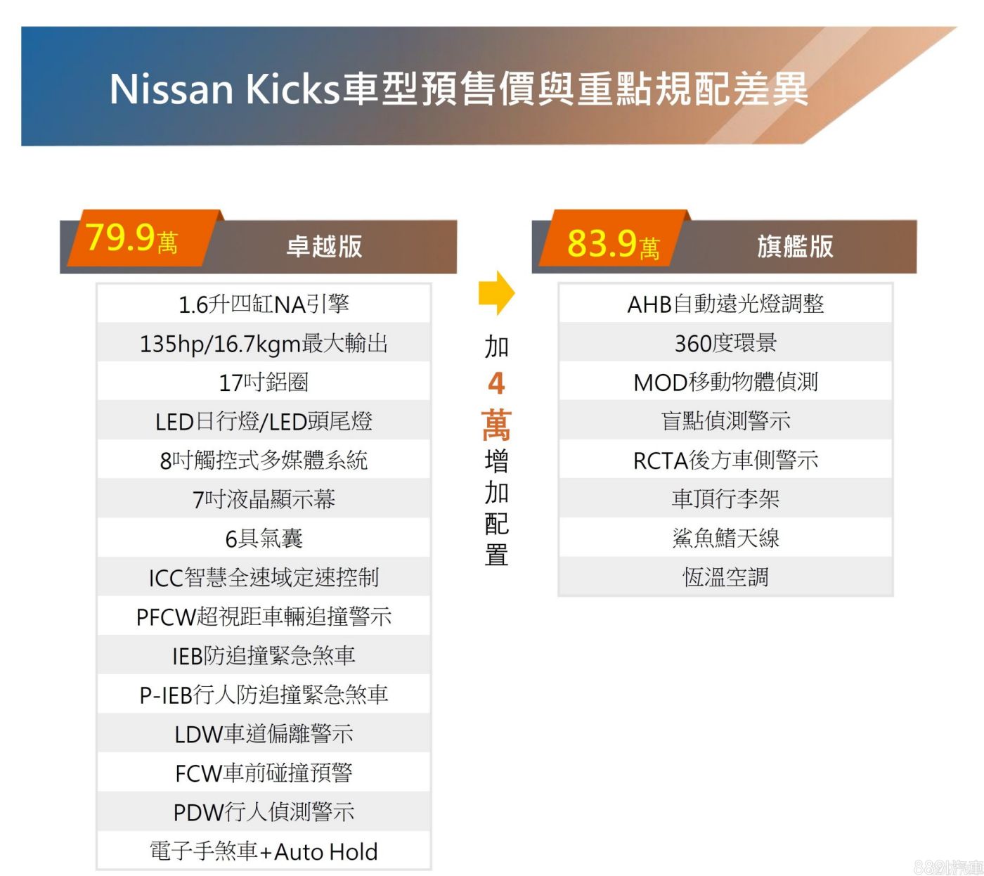 小改款Kicks預計10/6正式上市,首波將規劃單一動力雙車型,引擎由1.5升改換成1.6升新機體,並將多數主被動安全都列為標配,亮點是追加了舊款沒有的ICC全速域定速系統,頂規旗艦版則獨享360環景系統、自動遠光燈、盲點偵測等配備,目前開出預售價分別是79.9萬與83.9萬,以配備來說,誠意真的很不錯。