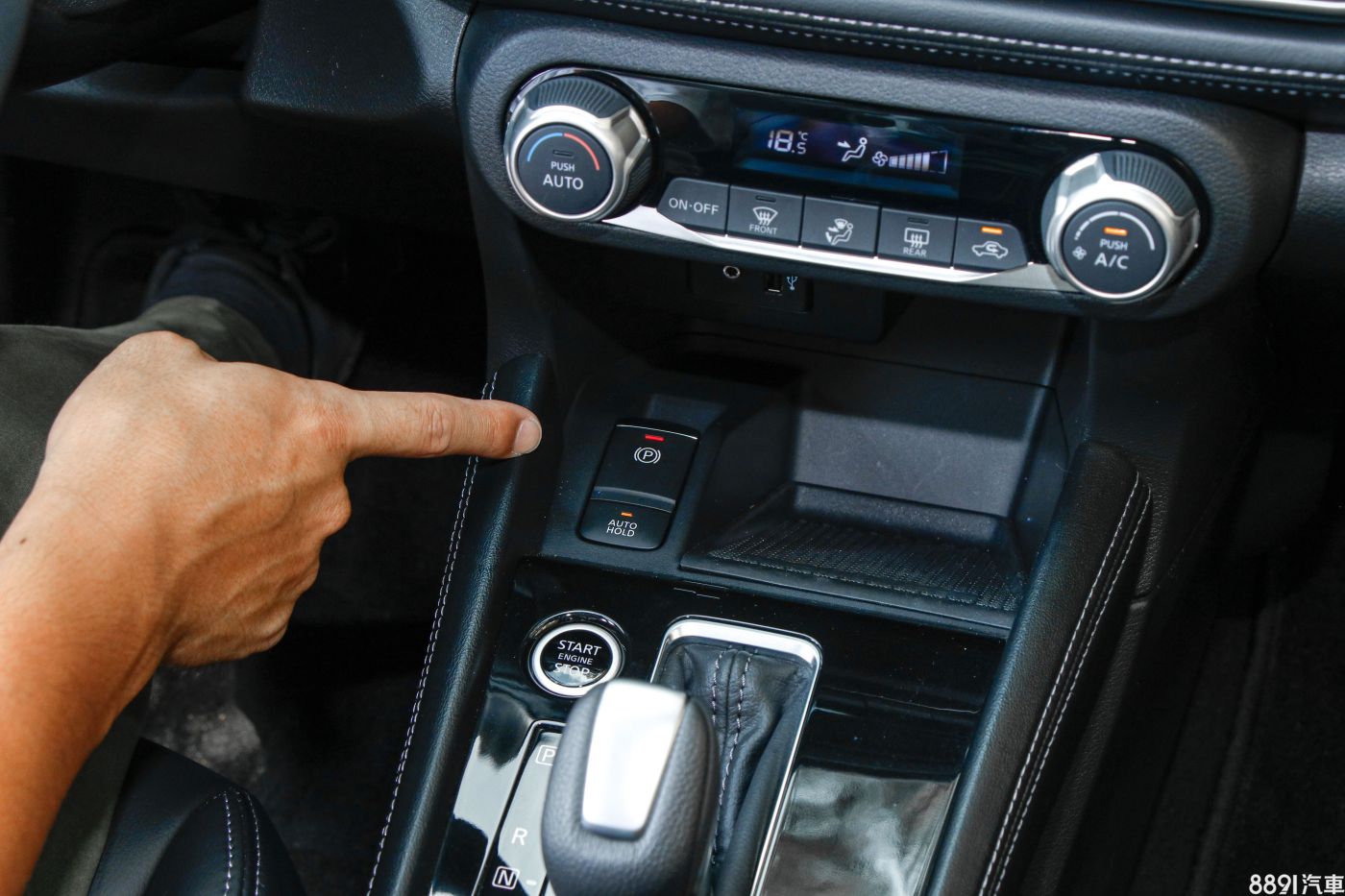 手煞車由傳統鋼索式改成電子線傳設計,這除了對車室空間運用有幫助,最重要的就是能與駕駛輔助系統有更好的整合性,不過位置設計在排檔前方,使用上總覺得有些不順手,需要伸長手臂才按得到。