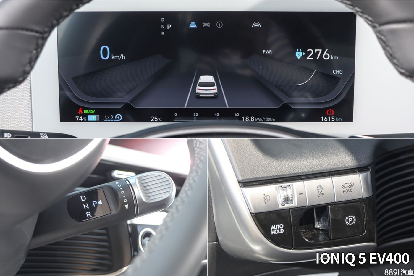 兩車的數位儀錶基本樣式差異不大,畫質都很好,介面也精美,單純邊框顏色不同就讓車室的氣氛有差別,Ioniq 5的排檔桿在方向盤右下方,看起來像是撥桿,使用方式卻不是像賓士那樣上下拉動,而是旋轉末端的旋鈕,電子手煞車和Auto Hold開關在駕駛左側,排到P檔會自動啟動駐車煞車、D檔解除,EV6則沒有這項功能,需要自己控制手煞車。