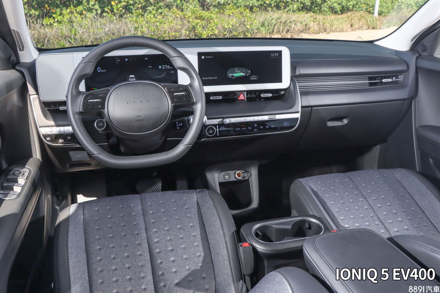 座艙配置很簡約,視覺重點在白色邊框的雙12.3吋螢幕,前座的腿部空間相通,坐在裡頭覺得開闊,另一方面,Ioniq 5強調內裝使用大量的永續材料,譬如寶特瓶回收製成的織物、頂篷和地毯是從甘蔗和玉米提煉的生物成分,跟在流行的環保浪潮中。