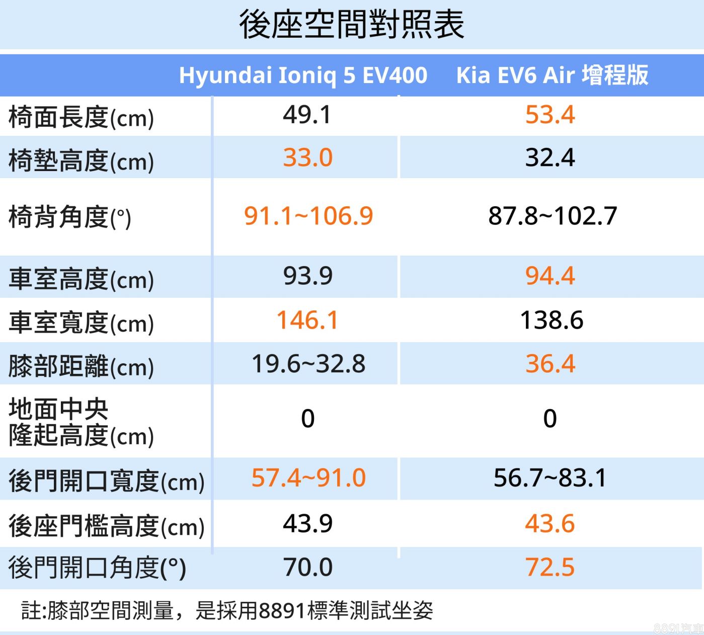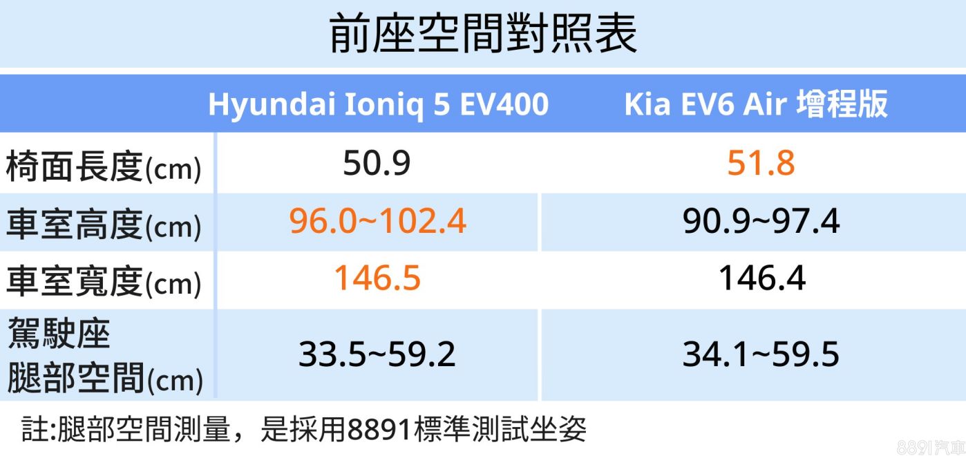 EV6後座雖然泡棉硬了點,不像Ioniq 5如沙發般柔軟,但剪裁夠立體,配合可調椅背角度,坐起來依舊符合人體工學,不過深色系內裝、高腰線設計,還是讓空間感多點壓迫,整體而言Ioniq 5還是比較放鬆舒適。視野圖表表格