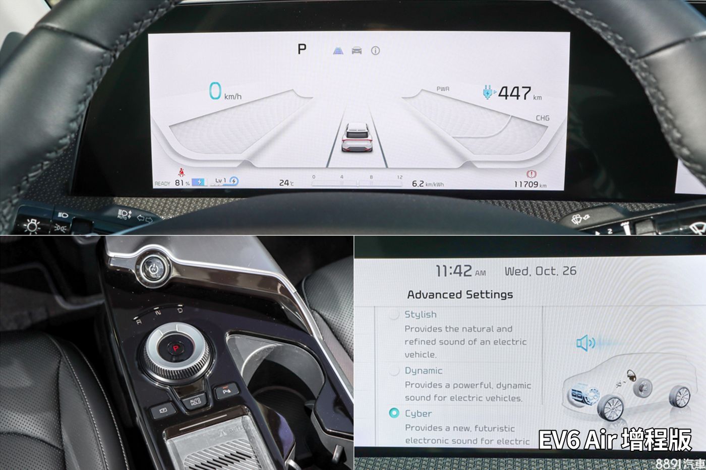 如果比較兩車的座艙質感,會是EV6好一些,材質運用更豐富,塑料感也更輕微,兩車的啟動鍵和排檔座位置不同,EV6連同Auto Hold開關,擺在更顯眼的地方,使用上也就是習慣之後就沒什麼區別,還有個地方體現EV6強調跑格的部分,是全車系標配VESS虛擬引擎音效系統,選項非常多,還可以依照速域自動播放不同風格的音效。空間圖片表格