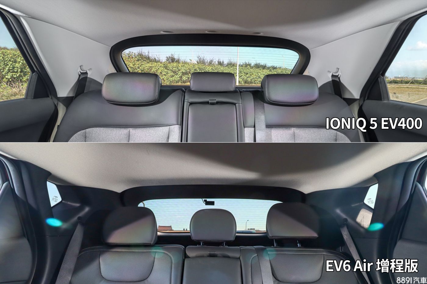 兩台車軸距都很長( Ioniq 5:3000mm、EV6:2900mm),因此膝部空間來說都非常寬裕,差異在於Ioniq 5後座多了前後滑移功能,讓乘坐空間、行李廂空間更靈活調度,增加了機能性,加上車室橫向寬度明顯更好,輔以淺色內裝、低腰線等因素,讓Ioniq 5後座空間感加乘。進出口便利也是Ioniq 5會好一些,有更大更方正的開口,整體來看Ioniq 5後座表現更勝EV6。