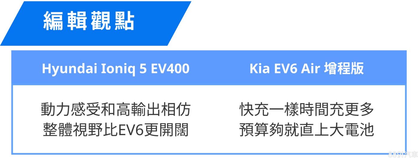 由於現代汽車婉拒借車,我們只能找到Ioniq 5 EV400,是58.0kWh小電池版本,對上77.4kWh大電池的Kia EV6 Air 增程版,兩車都是後驅、單馬達配置,在動力表現、續航里程上,看規格無疑是大電池優異,但正好能看看,在同樣800V架構下,大小電池耗能、充電效率有何差別?開起來又有甚麼不同?這將會是本次動態表現重點。