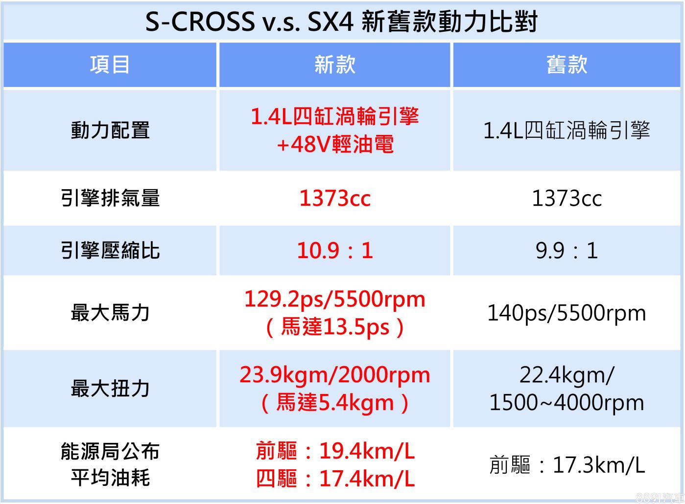 原因在於ALL NEW S-CROSS雖然導入四驅車型,但也改採與SWIFT SPORT、VITARA相同的輕油電動力架構,即以一具1.4升四缸渦輪引擎,加上48V ISG整合式啟動馬達協同出力,使ALL NEW S-CROSS不管是四驅還前驅車型,能源局油耗數據皆比前代來的優異。