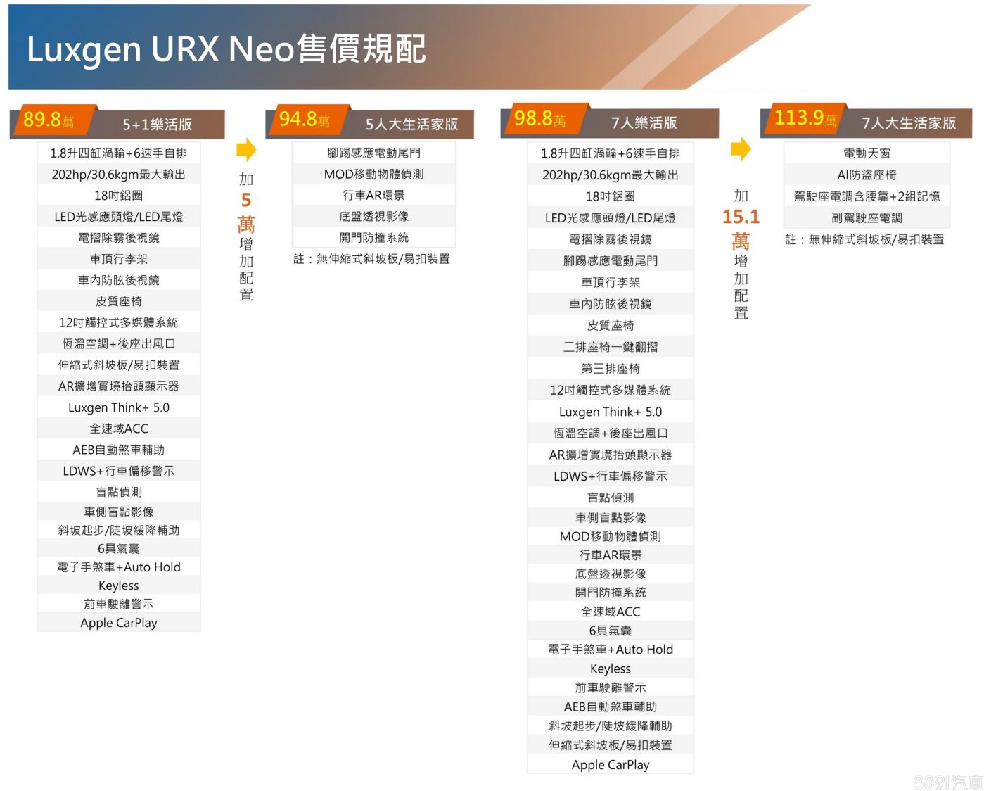 小改款後車系更名為URX Neo,並簡化編成至四種等級,提供兩款具多功能斜坡板的「樂活版」車型,與兩款純載客用的「大生活家」車型,售價89.8~113.9萬,定位較高階的大生活家車型,主要比入門樂活版多了電動尾門、全景天窗與電調座椅等便利性配備。