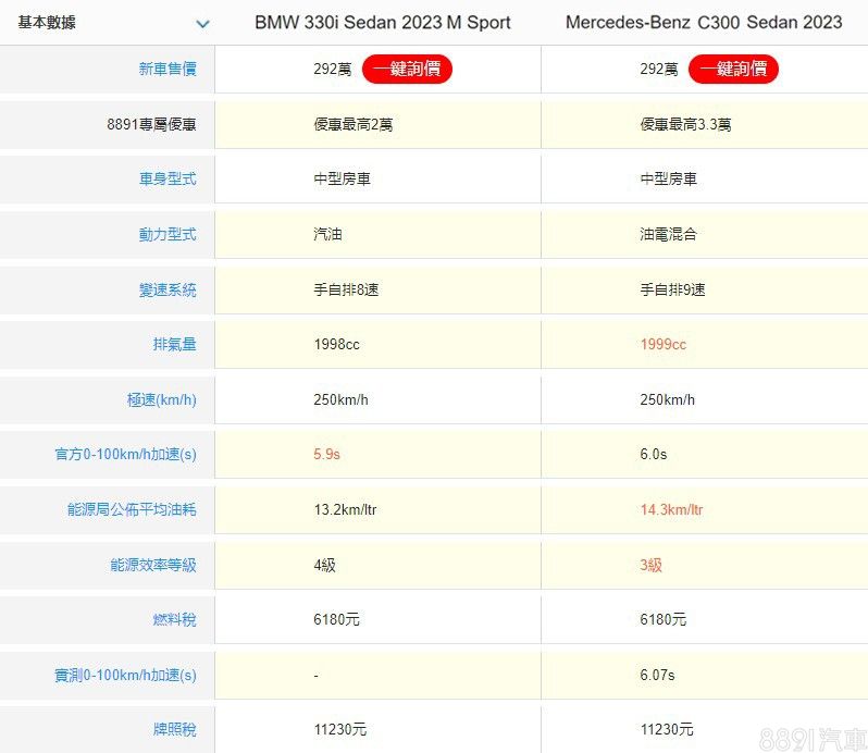 參考8891汽車站內優惠功能,兩款熱門豪華主管房車都有祭出優惠,基本配件的隔熱紙、行車紀錄器、防水踏墊都有,整體來看C-Class的優惠總額度較高。快試試8891的「一鍵詢價」或「優惠」功能,尋找附近業代報價!