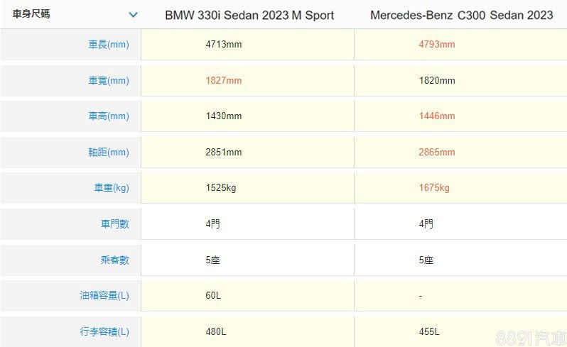 C 300車長、軸距都比330i略大一些,但不至於對於乘坐感造成巨大差異,兩車空間仍在同一級距內,較為顯著的差異反倒是在車重上,因為身負48V輕油電系統,也多少反應在C 300車重硬是比對手多了150kg。